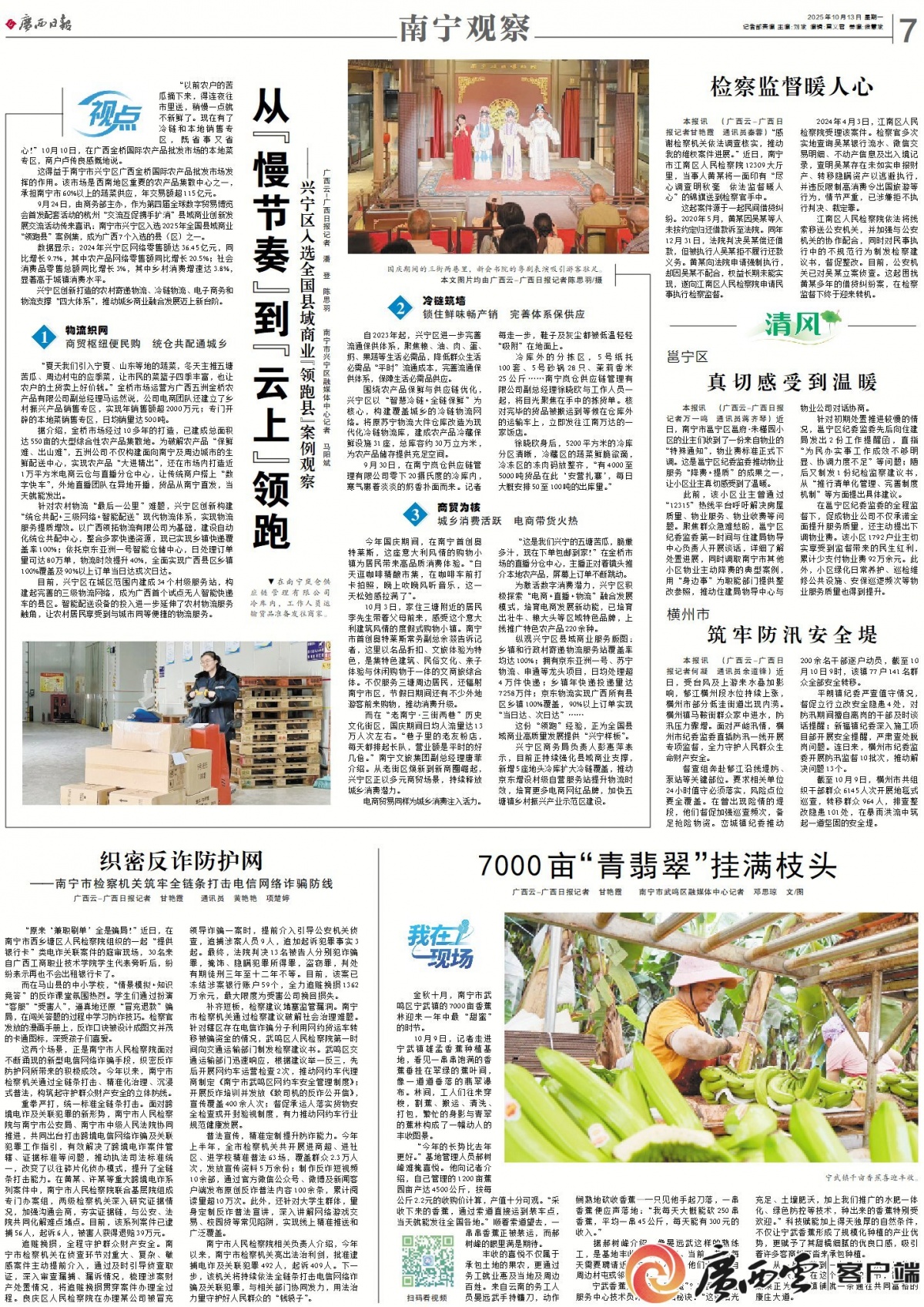 近日,南寧市興寧區(qū)入選2025年全國縣域商業(yè)“領(lǐng)跑縣”案例集,成為廣西7個(gè)入選的縣(區(qū))之一。廣西日?qǐng)?bào)南寧觀察版頭條刊發(fā)《從“慢節(jié)奏”到“云上”領(lǐng)跑——興寧區(qū)入選全國縣域商業(yè)“領(lǐng)跑縣”案例觀察》,呈現(xiàn)興寧區(qū)“領(lǐng)跑”經(jīng)驗(yàn),為全國縣域商業(yè)高質(zhì)量發(fā)展提供“興寧樣板”。 記者 陳思羽 攝制 市民在本地菜區(qū)挑選蔬菜。通訊員 劉偉 攝 “以前農(nóng)戶的苦瓜摘下來,得連夜往市里送,稍慢一點(diǎn)就不新鮮了。現(xiàn)在有了冷鏈和本地銷售專區(qū),既省事又省心!”10月10日,在廣西金橋國際農(nóng)產(chǎn)品批發(fā)市場的本地菜專區(qū),商戶盧傳良感慨地說。 這得益于南寧市興寧區(qū)廣西金橋國際農(nóng)產(chǎn)品批發(fā)市場發(fā)揮的作用。該市場是西南地區(qū)重要的農(nóng)產(chǎn)品集散中心之一,承擔(dān)南寧市60%以上的蔬菜供應(yīng),年交易額超115億元。 9月24日,由商務(wù)部主辦,作為第四屆全球數(shù)字貿(mào)易博覽會(huì)首發(fā)配套活動(dòng)的杭州“交流互促攜手?jǐn)U消”縣域商業(yè)創(chuàng)新發(fā)展交流活動(dòng)傳來喜訊:南寧市興寧區(qū)入選2025年全國縣域商業(yè)“領(lǐng)跑縣”案例集,成為廣西7個(gè)入選的縣(區(qū))之一。 數(shù)據(jù)顯示:2024年興寧區(qū)網(wǎng)絡(luò)零售額達(dá)36.45億元,同比增長9.7%,其中農(nóng)產(chǎn)品網(wǎng)絡(luò)零售額同比增長20.5%;社會(huì)消費(fèi)品零售總額同比增長3%,其中鄉(xiāng)村消費(fèi)增速達(dá)3.8%,顯著高于城鎮(zhèn)消費(fèi)水平。 興寧區(qū)創(chuàng)新打造的農(nóng)村寄遞物流、冷鏈物流、電子商務(wù)和物流支撐“四大體系”,推動(dòng)城鄉(xiāng)商業(yè)融合發(fā)展邁上新臺(tái)階。 鮮菜區(qū)裝卸新鮮蔬菜。通訊員 劉偉 攝 鮮菜區(qū)裝卸新鮮蔬菜。通訊員 劉偉 攝 物流織網(wǎng) 商貿(mào)樞紐便民購 統(tǒng)倉共配通城鄉(xiāng) “夏天我們引入寧夏、山東等地的蔬菜,冬天主推五塘苦瓜、周邊村屯的應(yīng)季菜,讓市民的菜籃子四季豐富,也讓農(nóng)戶的土貨賣上好價(jià)錢。”金橋市場運(yùn)營方廣西五洲金橋農(nóng)產(chǎn)品有限公司副總經(jīng)理馬運(yùn)然說,公司電商團(tuán)隊(duì)還建立了鄉(xiāng)村振興產(chǎn)品銷售專區(qū),實(shí)現(xiàn)年銷售額超2000萬元;專門開辟的本地菜銷售專區(qū),日均銷量達(dá)500噸。 據(jù)介紹,金橋市場經(jīng)過10多年的打造,已建成總面積達(dá)550畝的大型綜合性農(nóng)產(chǎn)品集散地。為破解農(nóng)產(chǎn)品“保鮮難、出山難”,五洲公司不僅構(gòu)建面向南寧及周邊城市的生鮮配送中心,實(shí)現(xiàn)農(nóng)產(chǎn)品“大進(jìn)精出”,還在市場內(nèi)打造近1萬平方米電商云倉與直播分倉中心,讓傳統(tǒng)商戶搭上“數(shù)字快車”,外地直播團(tuán)隊(duì)在異地開播,貨品從南寧直發(fā),當(dāng)天就能發(fā)出。 針對(duì)農(nóng)村物流“最后一公里”難題,興寧區(qū)創(chuàng)新構(gòu)建“統(tǒng)倉共配+三級(jí)網(wǎng)絡(luò)+智能配送”現(xiàn)代物流體系,實(shí)現(xiàn)物流服務(wù)提質(zhì)增效。以廣西領(lǐng)拓物流有限公司為基礎(chǔ),建設(shè)自動(dòng)化統(tǒng)倉共配中心,整合多家快遞資源,現(xiàn)已實(shí)現(xiàn)鄉(xiāng)鎮(zhèn)快遞覆蓋率100%;依托京東亞洲一號(hào)智能倉儲(chǔ)中心,日處理訂單量可達(dá)80萬單,物流時(shí)效提升40%,全面實(shí)現(xiàn)廣西縣區(qū)鄉(xiāng)鎮(zhèn)100%覆蓋及90%以上訂單當(dāng)日達(dá)或次日達(dá)。 目前,興寧區(qū)在城區(qū)范圍內(nèi)建成34個(gè)村級(jí)服務(wù)站,構(gòu)建起完善的三級(jí)物流網(wǎng)絡(luò),成為廣西首個(gè)試點(diǎn)無人智能快遞車的縣區(qū)。智能配送設(shè)備的投入進(jìn)一步延伸了農(nóng)村物流服務(wù)觸角,讓農(nóng)村居民享受到與城市同等便捷的物流服務(wù)。 在南寧嵐倉供應(yīng)鏈管理有限公司冷庫內(nèi),工作人員運(yùn)輸貨品準(zhǔn)備發(fā)往商家。記者 陳思羽 攝 冷庫儲(chǔ)藏。記者 陳思羽 攝 冷鏈筑墻 鎖住鮮味暢產(chǎn)銷 完善體系保供應(yīng) 自2023年起,興寧區(qū)進(jìn)一步完善流通保供體系,聚焦糧、油、肉、蛋、奶、果蔬等生活必需品,降低群眾生活必需品“平時(shí)”流通成本,完善流通保供體系,保障生活必需品供應(yīng)。 圍繞農(nóng)產(chǎn)品保鮮與供應(yīng)鏈優(yōu)化,興寧區(qū)以“智慧冷鏈+全鏈保鮮”為核心,構(gòu)建覆蓋城鄉(xiāng)的冷鏈物流網(wǎng)絡(luò)。將原蘇寧物流大件倉庫改造為現(xiàn)代化冷鏈物流庫,建成農(nóng)產(chǎn)品冷藏保鮮設(shè)施31座,總庫容約30萬立方米,為農(nóng)產(chǎn)品儲(chǔ)存提供充足空間。 9月30日,在南寧嵐倉供應(yīng)鏈管理有限公司零下20攝氏度的冷庫內(nèi),寒氣裹著淡淡的奶香撲面而來。記者每走一步,鞋子及灰塵都被低溫輕輕“吸附”在地面上。 冷庫外的分揀區(qū),5號(hào)紙托100套、5號(hào)砂鍋28只、茉莉香米25公斤……南寧嵐倉供應(yīng)鏈管理有限公司副總經(jīng)理徐曉歐與工作人員一起,將目光聚焦在手中的揀貨單。核對(duì)完畢的貨品被搬運(yùn)到等候在倉庫外的運(yùn)輸車上,立即發(fā)往江南