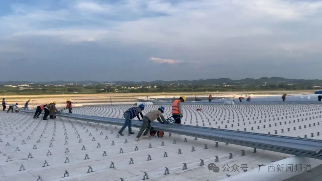近日,南寧吳圩國際機場T3航站樓二標段項目金屬屋面工程進入緊張施工階段,屋面已披上銀白色的“新衣”。據了解,穿上新衣的過程可不簡單 ,其中還蘊含了不少“黑科技”,一起去看一下。 南寧吳圩國際機場T3航站樓改擴建屋面工程,建筑面積約30.5萬平方米,金屬屋面工程是機場建筑的“防護屏障”,施工難度又是一項工程硬仗。 T3航站樓的金屬屋面從下到上共9層,最下層為主檁條,最上層為面層。金屬屋面面積龐大,僅二標段屋面面積約13.4萬平方米。這9層屋面材料需要按順序一層層鋪設施工,才能達到防曬、隔音、防水、保溫、隔汽等功能。值得一提的是,T3航站樓的金屬屋面可以達到防12級臺風的防風效果。 據了解,金屬屋面的面層材料最長為79米,施工單位創新采用“專用壓板機加索道”方式將面層材料輸送上屋頂后,為確保金屬屋面的安裝精度,項目采用BIM進行模型深化設計,利用科技助力項目高效、精準施工。 中建二局南寧吳圩國際機場T3航站樓二標段金屬屋面項目副經理史國杰介紹,項目從2025年3月份開始施工,已經進行到收尾階段,整體竣工時間段是在(今年)11月30日。 |