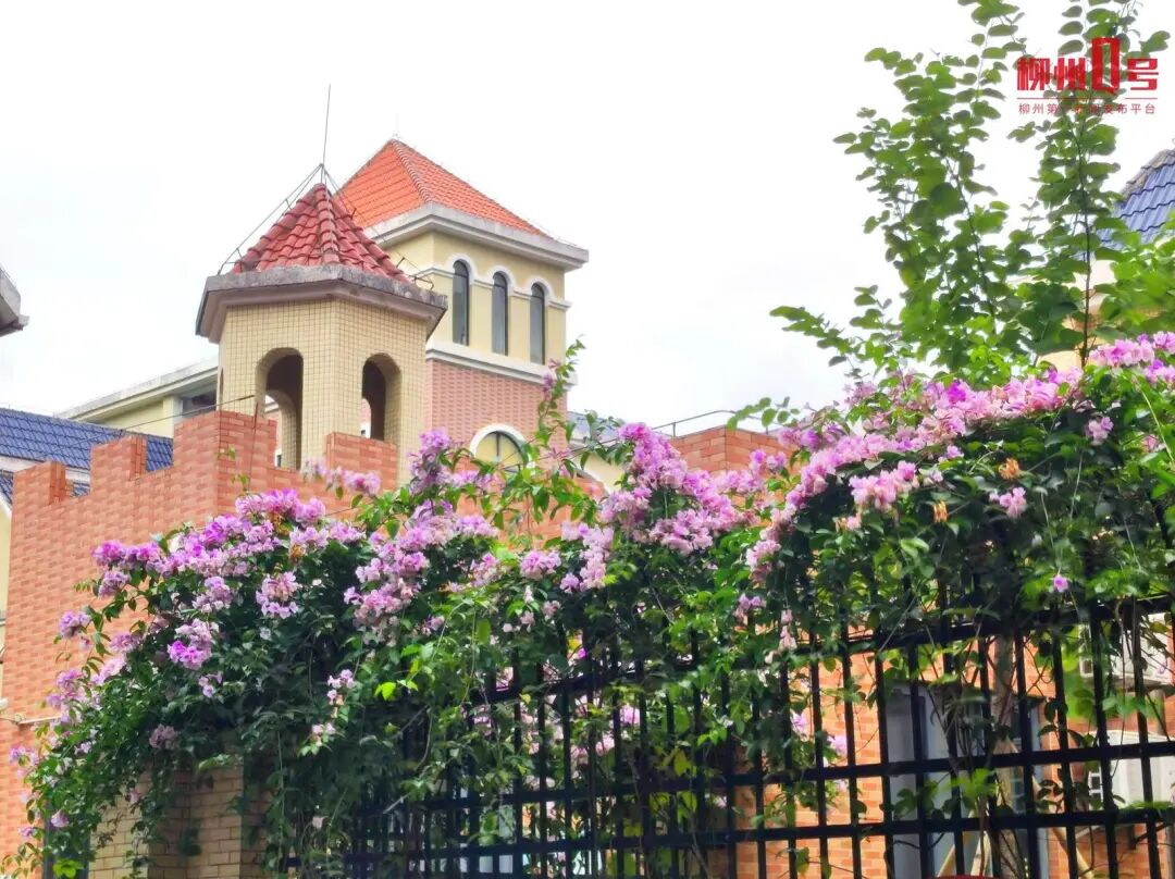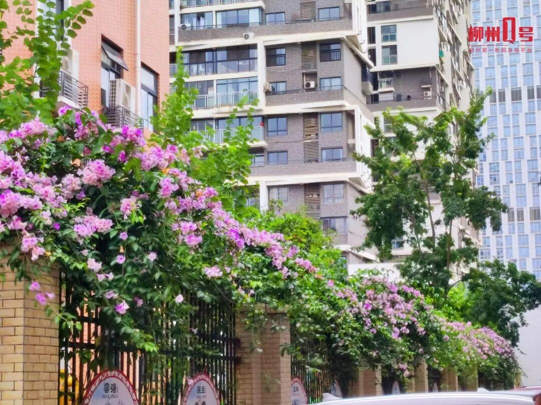 游客在龍潭公園八龍壩賞花。 翠綠的藤蔓纏繞著籬笆,喇叭狀的花朵簇擁成瀑,廣西科技大學幼兒園旁的籬笆墻也悄然成為“打卡點”。