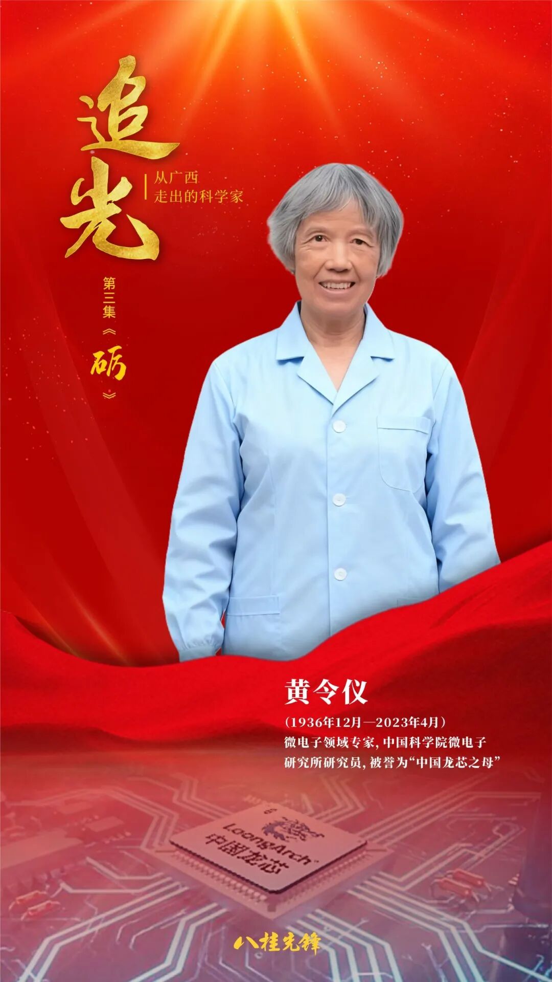 黃令儀,原名廖文蒂, 1936年12月生于廣西南寧,在她不滿一歲的時候,全面抗戰爆發。 抗戰期間,日軍兩次入侵廣西,空襲1600多次,直接傷亡超過200萬人,其中28000多名兒童死于非命。據說逃難中的黃令儀曾問媽媽,為什么我們會挨打?媽媽說:因為我們弱小,只有我們強大了,才會不受欺凌。 1949年,新中國成立,13歲的黃令儀坐進了嶄新的課堂。1954年她以優異的成績考入華中工學院,一年后加入中國共產黨,她在日記中寫到:“無論道路多么曲折、艱難,我一定要把自己終身的努力獻給共產主義事業!” 1958年,黃令儀進入清華大學深造,主攻半導體器件研發,從此與芯片事業結緣。 1962年,黃令儀進入中國科學院計算技術研究所,那時她并不知道自己接下來的工作將會被列為國家最高機密:為“搭載導彈的火箭”和“衛星”研發微型計算機。 1964年10月16日,中國第一顆原子彈爆炸成功。 1967年6月17日,中國第一顆氫彈空爆試驗成功。 1970年4月24日,中國第一顆人造地球衛星發射成功。 巨大的喜悅激勵著每一個中國人,但當時幾乎沒人知道,《東方紅》的旋律,正是在黃令儀帶隊研發的計算機里隨衛星進入太空的。 她在回憶錄里寫到:“當從收音機里聽到衛星上傳回地球的《東方紅》樂曲時,我們整個團隊都哭了。”那一年黃令儀34歲。 廣西質量工程職業技術學院是最早和黃令儀生前單位“龍芯中科”建立合作的高校之一,每年新生入學,老師都會為學生們講述黃令儀的故事。除此之外學校還緊跟時代潮流,制作了黃令儀的AI數字人。 1978年,改革的號角在神州大地吹響,芯片需求量激增。1989年,黃令儀受邀參加美國國際芯片展,走遍會場,沒有一枚中國芯片。她在當天的日記中寫到:“琳瑯滿目非國貨,淚眼漣漣”。回國后,她厲兵秣馬,苦戰10年。2000年,在德國國際發明專利博覽會上,黃令儀團隊設計的芯片獲得銀獎,代表中國實現該領域“零”的突破,得知消息,她奮筆疾書:“神州之尊重泰山,赤子榮辱輕鴻毛;靈臺無計四十載,不覺青絲已成雪。”那一年黃令儀64歲。