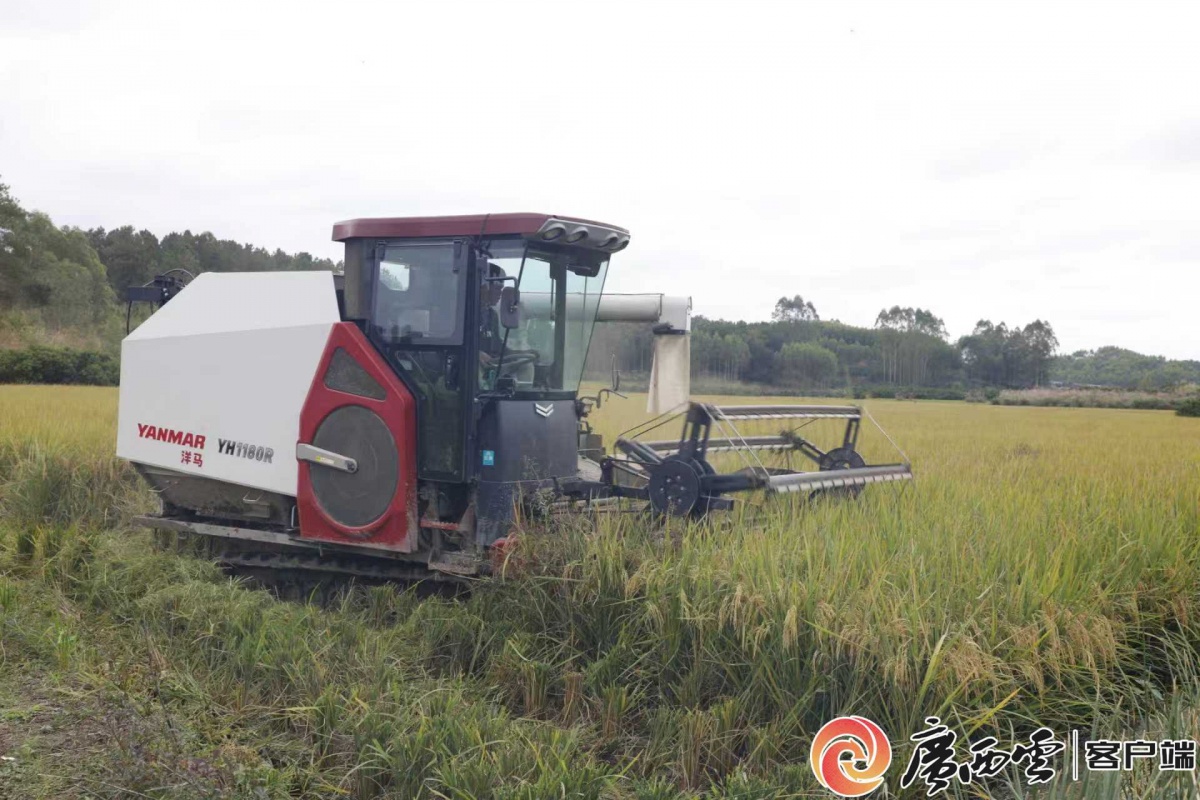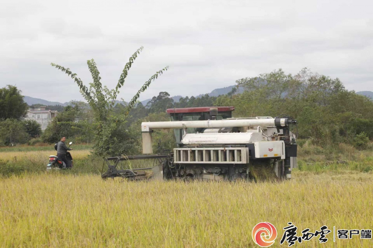 近日,八桂大地稻浪翻滾,滿目金黃,空氣中彌漫著稻谷特有的清香。在荔浦市杜莫鎮的連片稻田里,數臺大型聯合收割機正開足馬力來回穿梭,切割、脫粒、粉碎稻稈一氣呵成,種糧大戶黃佑生站在田埂上,看著金燦燦的稻谷從卸糧口傾瀉而下,臉上洋溢著豐收的喜悅。