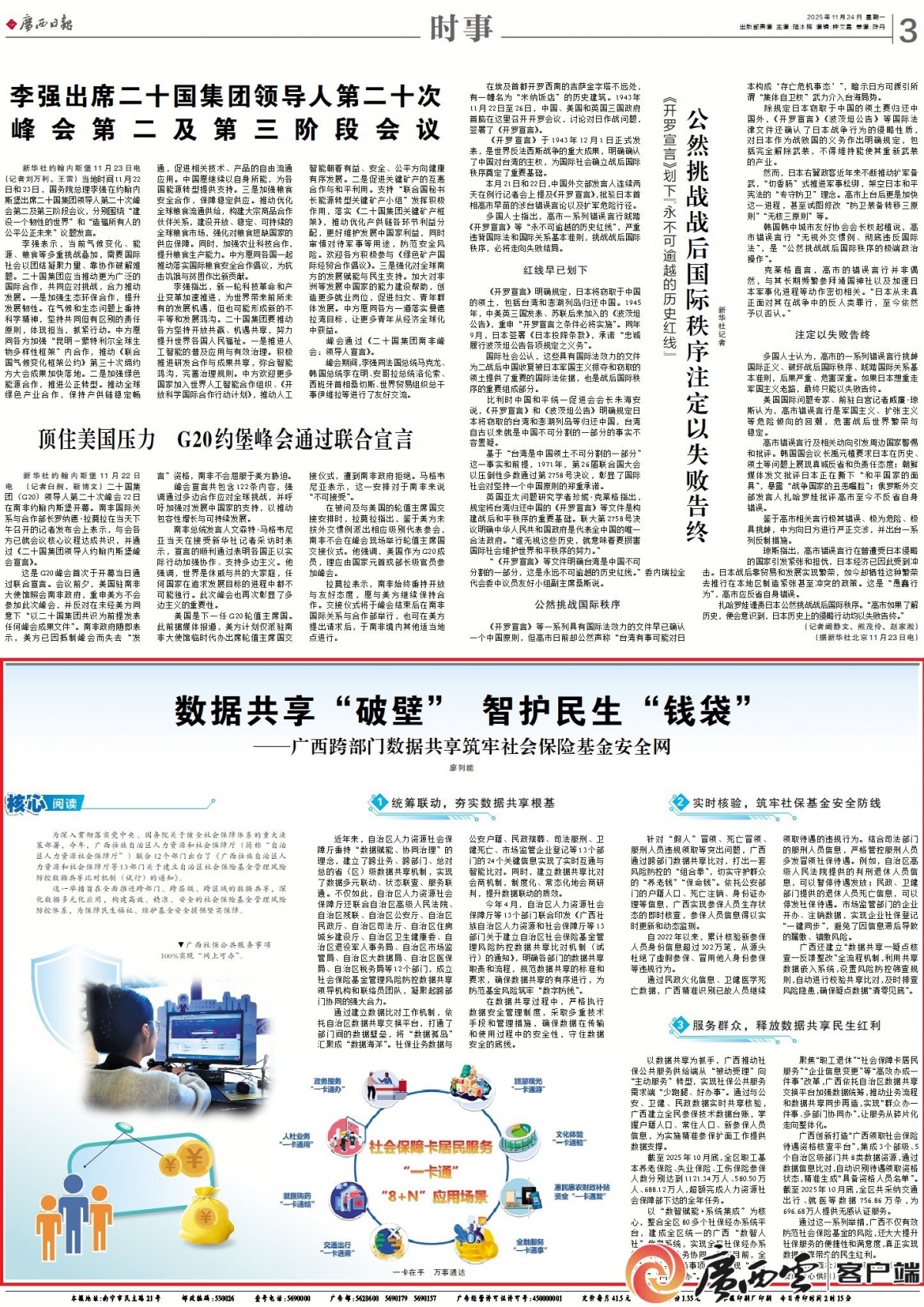 一卡在手 萬事通達。 2 實時核驗,筑牢社保基金安全防線 針對“假人”冒領、死亡冒領、服刑人員違規領取等突出問題,廣西通過跨部門數據共享比對,打出一套風險防控的“組合拳”,切實守護群眾的“養老錢”“保命錢”。依托公安部門的戶籍人口、死亡注銷、身份證辦理等信息,廣西實現參保人員生存狀態的即時核查,參保人員信息得以實時更新和動態監測。 自2022年以來,累計核驗新參保人員身份信息超過302萬筆,從源頭杜絕了虛假參保、冒用他人身份參保等違規行為。 通過民政火化信息、衛健醫學死亡數據,廣西精準識別已故人員繼續領取待遇的違規行為。結合司法部門的服刑人員信息,嚴格管控服刑人員多發冒領社保待遇。例如,自治區高級人民法院提供的判刑退休人員信息,可以暫停待遇發放;民政、衛健部門提供的退休人員死亡信息,可以停發社保待遇。市場監管部門的企業開辦、注銷數據,實現企業社保登記“一鍵同步”,避免了因信息滯后導致的漏繳、錯繳風險。 廣西還建立“數據共享—疑點核查—反饋整改”全流程機制,利用共享數據嵌入系統,設置風險防控篩查規則,自動進行校驗共享比對,及時排查風險隱患,確保疑點數據“清零見底”。 3 服務群眾,釋放數據共享民生紅利 以數據共享為抓手,廣西推動社保公共服務供給端從“被動受理”向“主動服務”轉型,實現社保公共服務需求端“少跑腿、好辦事”。通過與公安、衛健、民政數據實時共享核驗,廣西建立全民參保技術數據臺賬,掌握戶籍人口、常住人口、新參保人員信息,為實施精準參保擴面工作提供數據支撐。 截至2025年10月底,全區職工基本養老保險、失業保險、工傷保險參保人數分別達到1121.34萬人、580.50萬人、688.12萬人,超額完成人力資源社會保障部下達的全年任務。 以“數智賦能+系統集成”為核心,整合全區80多個社保經辦系統平臺,建成全區統一的廣西“數智人社”信息系統,實現全區社保經辦系統的聯通和業務協同。截至目前,全區社保公共服務事項100%實現“全區通辦”“網上可辦”。 聚焦“職工退休”“社會保障卡居民服務”“企業信息變更”等“高效辦成一件事”改革,廣西依托自治區數據共享交換平臺加強數據統籌,推動業務流程和數據共享同步再造,實現“群眾辦一件事、多部門協同辦”,讓服務從碎片化走向整體化。 廣西創新打造“廣西領取社會保險待遇資格核查平臺”,集成3個部級、5個自治區級部門共8類數據資源,通過數據信息比對,自動識別待遇領取資格狀態,精準生成“具備資格人員名單”。截至2025年10月底,全區共采納交通出行、就醫等數據756.86萬條,為696.68萬人提供無感認證服務。 通過這一系列舉措,廣西不僅有效防范社會保險基金的風險,還大大提升社保服務的便捷性和滿意度,真正實現數據共享帶來的民生紅利。 (廣西壯族自治區社會保險事業管理中心供圖)