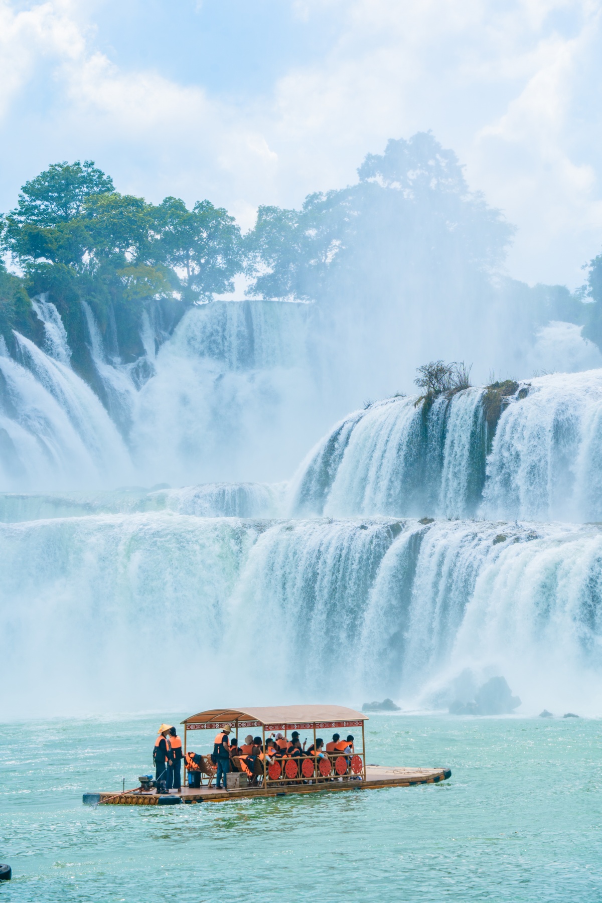 ▲氣勢磅礴的德天跨國瀑布。德天跨國瀑布景區供圖 最帶感的莫過于在中越界河乘竹筏近距離觀賞德天跨國瀑布了! 瀑布水聲轟鳴,與周圍人說話都得靠喊;水汽撲面,不由分說,霸道地給你來了個“保濕噴霧”附加服務。