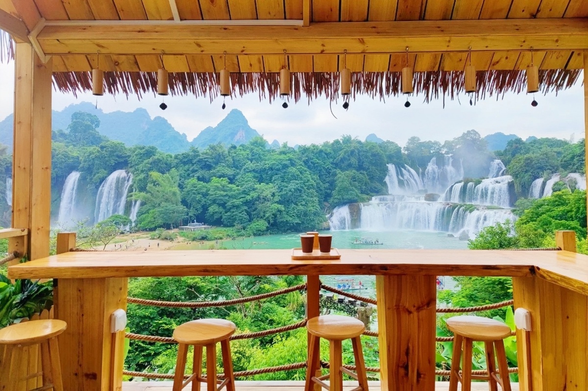▲稻田咖啡屋觀瀑打卡點。德天跨國瀑布景區供圖 走進中越風情街、中越跨境街,可以打卡特色店鋪,品嘗壯族簸箕宴、越南四喜小吃拼盤等特色美食。