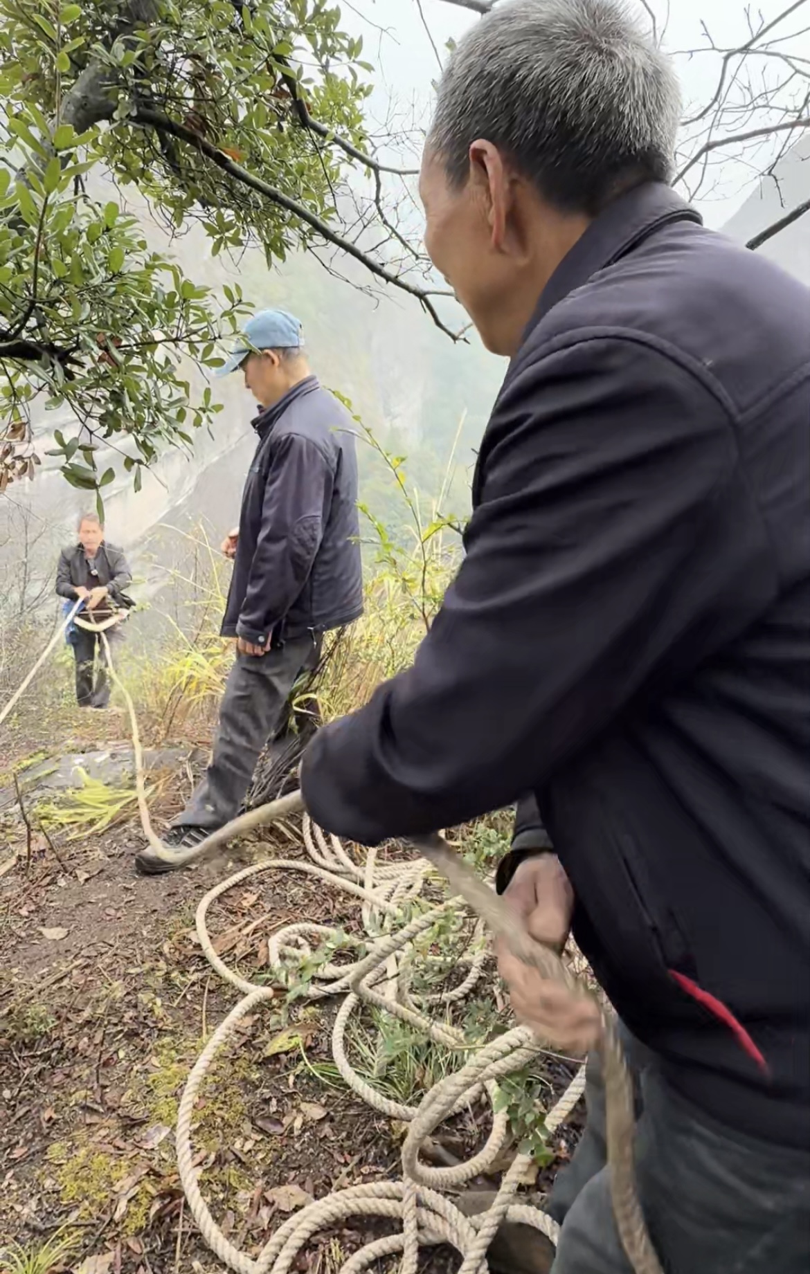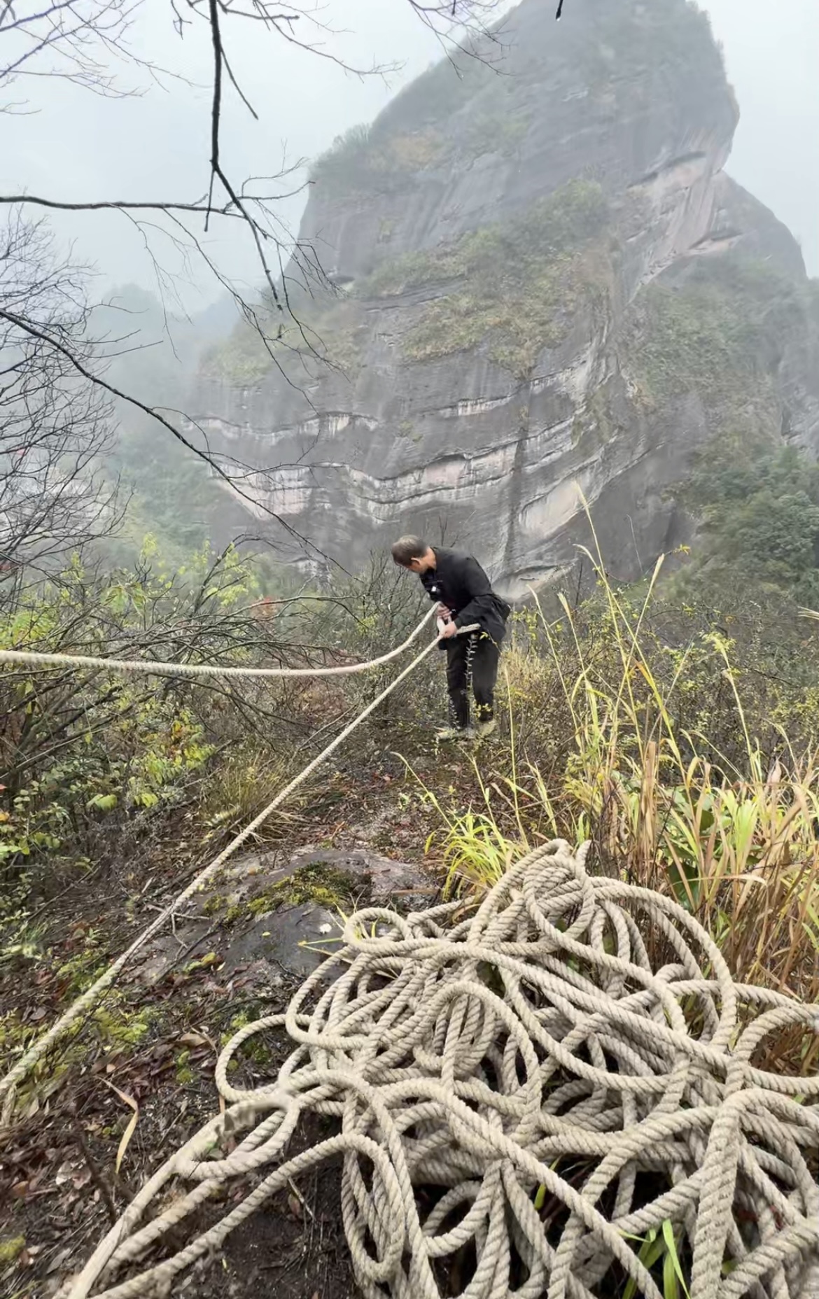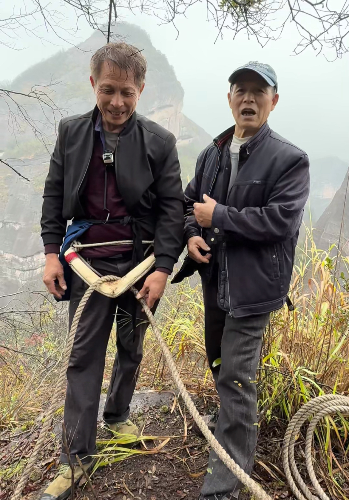 年齡加起來快200歲的采藥隊伍。 來到山頂 綁好腰袢和繩索的易忠亮準備下山采藥 老易和妹夫在山頂拉繩索