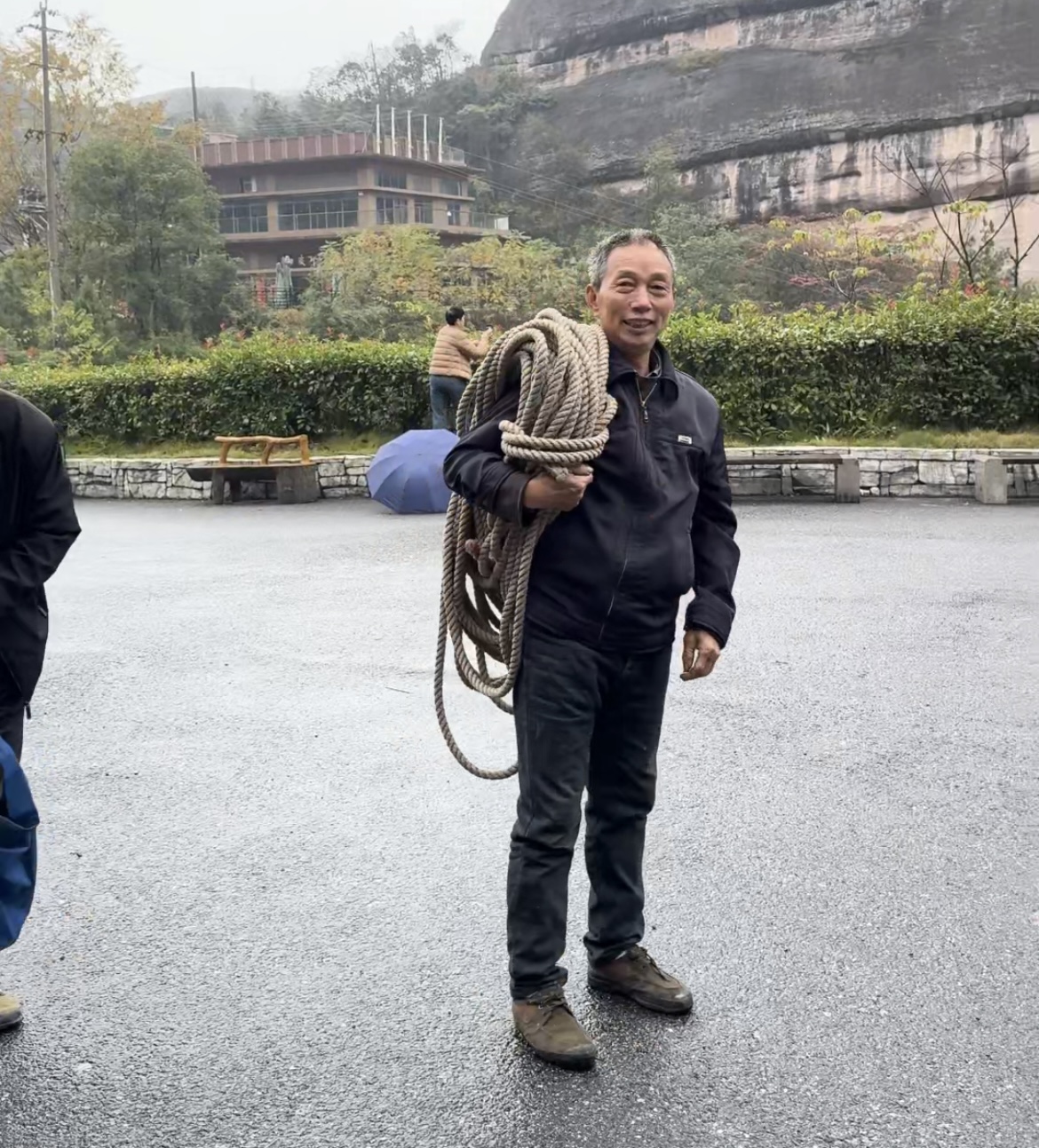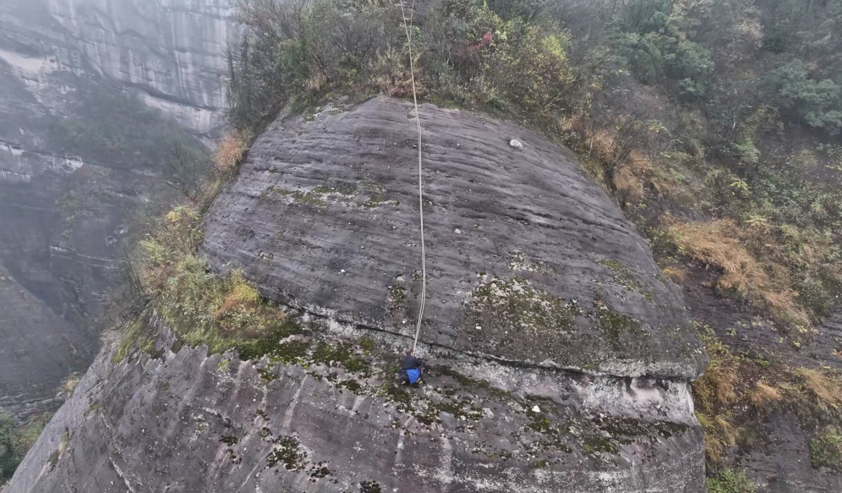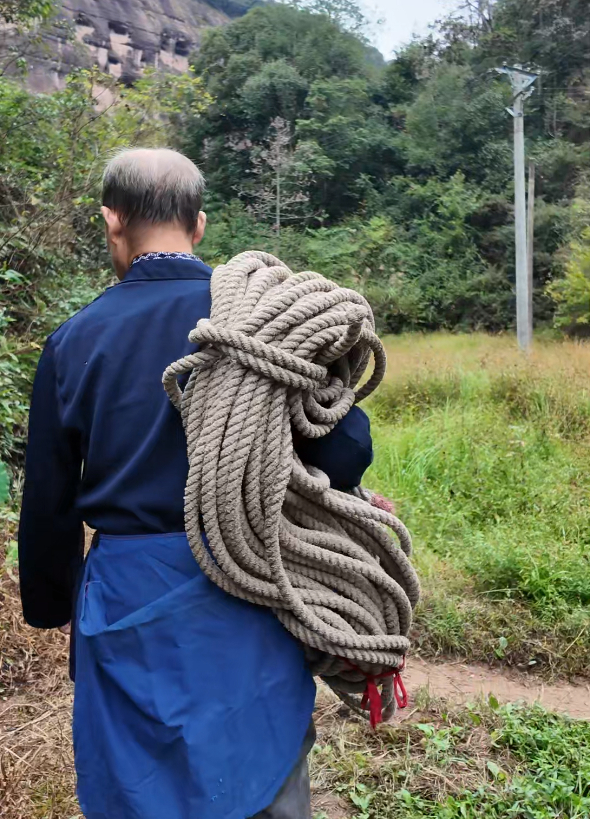 年齡加起來快200歲的采藥隊伍。 來到山頂 綁好腰袢和繩索的易忠亮準備下山采藥 老易和妹夫在山頂拉繩索