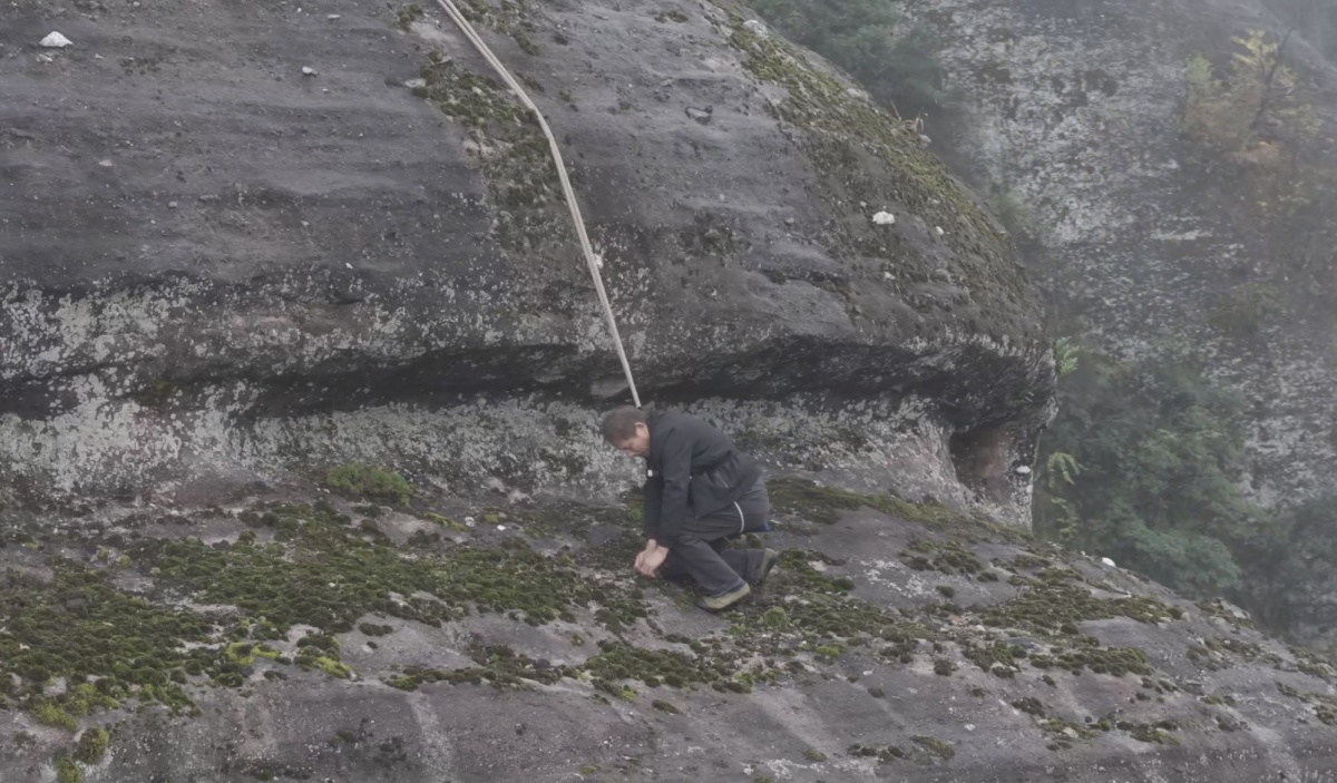 他們的身手絲毫不輸年輕人 尋找藥草蹤跡、下繩索、綁腰袢、攀山采藥 每一個程序都嚴謹穩當 看著這幾乎垂直的懸崖絕壁 忍不住問他們“怕不怕” “不怕的,我們都已經習慣了,只要按規矩來,不危險的”