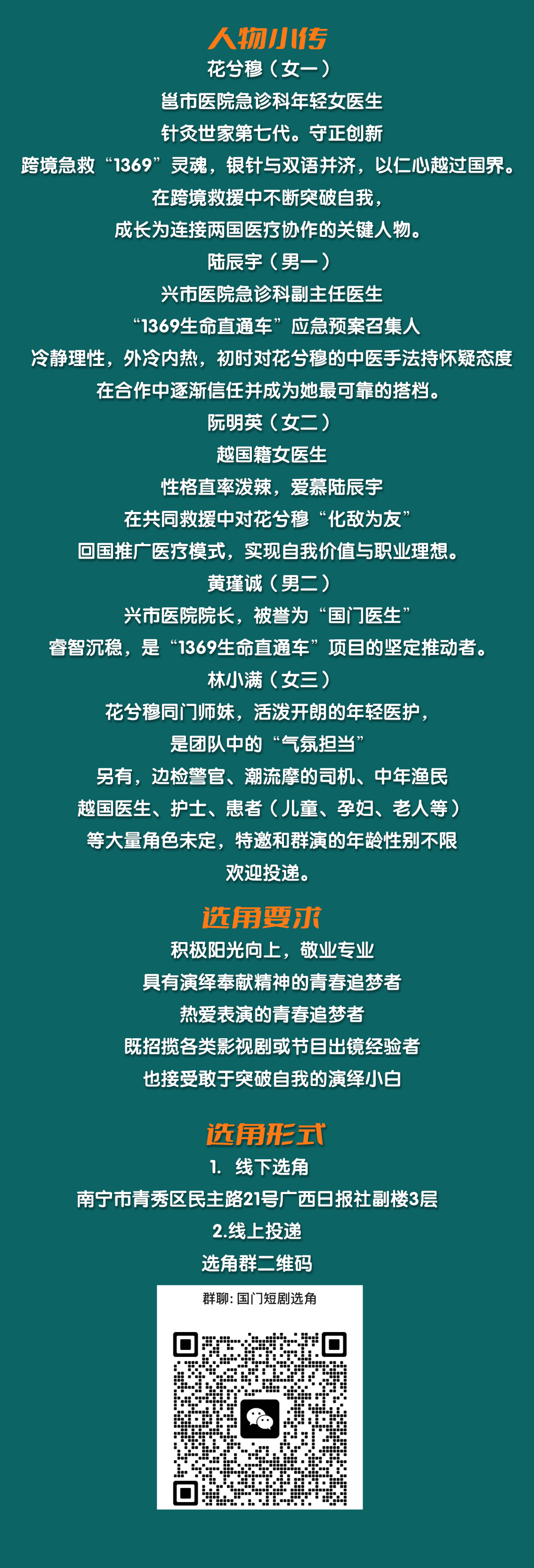故事簡(jiǎn)介 本次招募聚焦角色鮮明、富有使命感的青年群像:花兮穆(女主)需展現(xiàn)仁心仁術(shù)、守正創(chuàng)新的年輕女醫(yī)生氣質(zhì),兼具醫(yī)者擔(dān)當(dāng)與人文溫度;陸辰宇(男主)需塑造外冷內(nèi)熱、理性專(zhuān)業(yè)的急診精英形象;阮明英(女二)需呈現(xiàn)直率天真、積極主動(dòng)的留學(xué)生特質(zhì)。此外,還有“國(guó)門(mén)醫(yī)生”黃謹(jǐn)誠(chéng)、林小滿等特邀演員,及其他醫(yī)生專(zhuān)家、醫(yī)護(hù)、患者、邊檢人員等群像角色若干,誠(chéng)邀具備影視劇表演者或?qū)Ρ緞」睬榈难輪T參與出演。 選拔標(biāo)準(zhǔn):熱愛(ài)表演,陽(yáng)光敬業(yè),有影視劇、話劇表演等經(jīng)驗(yàn)者優(yōu)先;歡迎敢哭敢打、敢飆越南語(yǔ)的“小白”挑戰(zhàn)自我。 拍攝地點(diǎn):該劇將于12月初在中國(guó)東興開(kāi)機(jī),后續(xù)央視頻、抖音、紅果劇場(chǎng)以及海外短劇平臺(tái)同步上線。 報(bào)名時(shí)間:即日起至11月30日 報(bào)名方式: 1.掃描海報(bào)二維碼進(jìn)入“國(guó)門(mén)短劇選角”群,下載報(bào)名表; 2.線下試鏡:南寧市青秀區(qū)民主路21號(hào)廣西日?qǐng)?bào)社廣西云演播廳(時(shí)間:11月30日下午2點(diǎn)); 3.線上投遞:劇照或生活照+影視劇演繹視頻鏈接或視頻片段,發(fā)送至郵箱1165016476@qq.com。 來(lái)吧!用你的真情演繹,呈現(xiàn)國(guó)門(mén)醫(yī)生的感人故事,用故事連接中越民心!