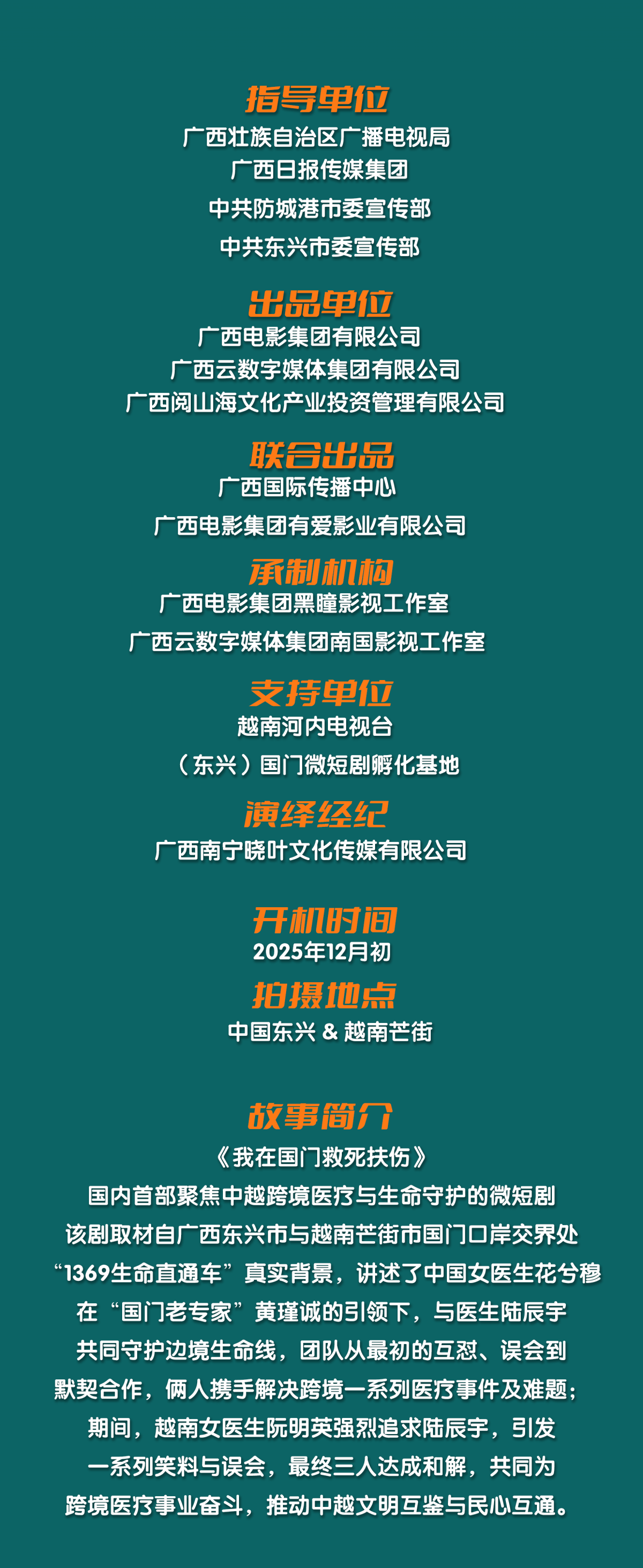 主題海報(bào) 國(guó)內(nèi)首部聚焦中越兩國(guó)跨境醫(yī)療與生命守護(hù)的微短劇《我在國(guó)門(mén)救死扶傷》,正式招募演員啦! 該劇由廣西電影集團(tuán)、廣西云數(shù)字媒體集團(tuán)和廣西閱山海文化產(chǎn)業(yè)投資管理有限公司等聯(lián)合出品,廣西國(guó)際傳播中心、越南河內(nèi)電視臺(tái)和國(guó)門(mén)微短劇孵化基地等單位機(jī)構(gòu)支持。故事取材自廣西東興市與越南芒街市國(guó)門(mén)口岸交界處“1369生命直通車(chē)”真實(shí)背景,講述了中國(guó)青年醫(yī)生花兮穆調(diào)任邊境興市醫(yī)院,在“國(guó)門(mén)老專(zhuān)家”黃謹(jǐn)誠(chéng)引領(lǐng)下,與冷靜嚴(yán)謹(jǐn)?shù)年懗接钪魅巍⒅甭蕽娎钡脑絿?guó)女醫(yī)生阮明英攜手,共同面對(duì)語(yǔ)言文化差異與醫(yī)療體制碰撞,在一次次驚心動(dòng)魄的跨境急救中守護(hù)生命、傳遞大愛(ài)的動(dòng)人故事。劇中既有急診一線的緊張救援,也有跨越國(guó)界的溫情守護(hù)與青春成長(zhǎng),生動(dòng)展現(xiàn)“醫(yī)學(xué)無(wú)國(guó)界,仁心有共鳴”的時(shí)代主題,推動(dòng)中越文明互鑒與民心互通。