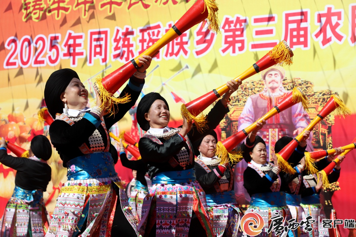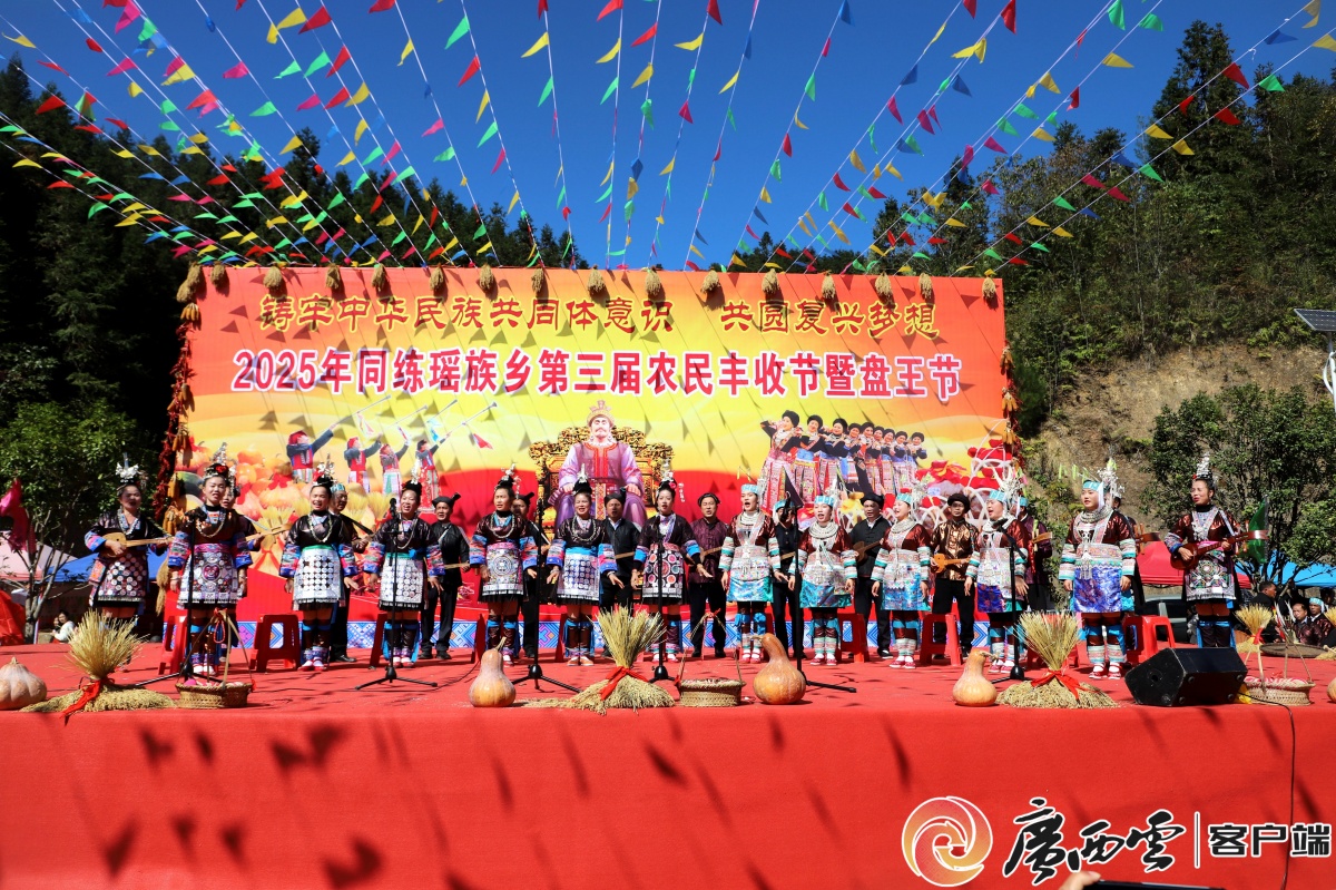圖為盛大的節(jié)日現(xiàn)場。覃美 劉通 攝 11月22日,融水苗族自治縣同練瑤族鄉(xiāng)第三屆農(nóng)民豐收節(jié)暨盤王節(jié)正式開幕,各族同胞身著節(jié)日盛裝,與四方賓朋歡聚一堂,共慶豐收喜悅,共享民族文化盛宴,共同見證鄉(xiāng)村振興戰(zhàn)略下的同練新面貌。 上午十時,慶典在悠揚的嗩吶聲中正式拉開序幕。豐收節(jié)盤王祭儀式上,金黃的稻谷、碩大的南瓜與軟糯香甜的糯米糍整齊陳列,身著傳統(tǒng)服飾的瑤族同胞手持銅鈴,在師爺?shù)膸ьI下踏著古舞步誦讀祭文,緬懷盤王先祖功績,祈求來年風調(diào)雨順、百業(yè)興旺。 祭祀禮成后,文藝展演精彩紛呈。國家級非物質(zhì)文化遺產(chǎn)瑤族長鼓舞鏗鏘激昂,鼓點與舞步交織間,將瑤族人民的豪邁與文化底蘊展現(xiàn)得淋漓盡致;原生態(tài)侗族琵琶歌謠婉轉(zhuǎn)悠揚,琴弦輕撥中唱出各民族群眾對美好生活的憧憬與贊頌;同練瑤族鄉(xiāng)與貴州水族同胞聯(lián)袂演繹的水族銅鼓舞,雄渾鼓點穿越地域界限,既彰顯了水族“以鼓傳情”的非遺魅力,更讓現(xiàn)場觀眾深切感受到黔桂少數(shù)民族文化交融共生的獨特韻味。