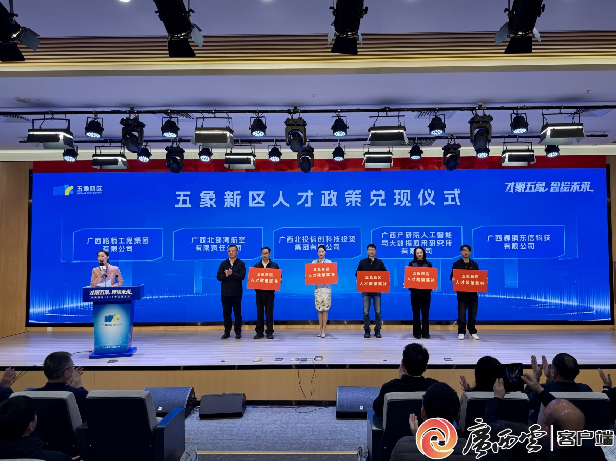 五象新區(qū)人才政策兌現(xiàn)儀式。陳思羽 攝 為充分發(fā)揮南A中心牽引作用,推動五象新區(qū)人工智能等重點產(chǎn)業(yè)發(fā)展,激發(fā)人才創(chuàng)新創(chuàng)造活力,為建設面向東盟的開放合作先行區(qū)提供有力的人才支撐,11月28日,五象新區(qū)管委會在南A中心舉辦2025年“才聚五象 智繪未來”主題活動,五象新區(qū)黨工委委員、管委會副主任左孔天出席活動并致辭;顒游黝惾瞬、百余家轄區(qū)企業(yè)及廣西民族大學、桂林電子科技大學南寧研究院、南寧師范大學、南寧職業(yè)技術大學等8家高職院校參與。