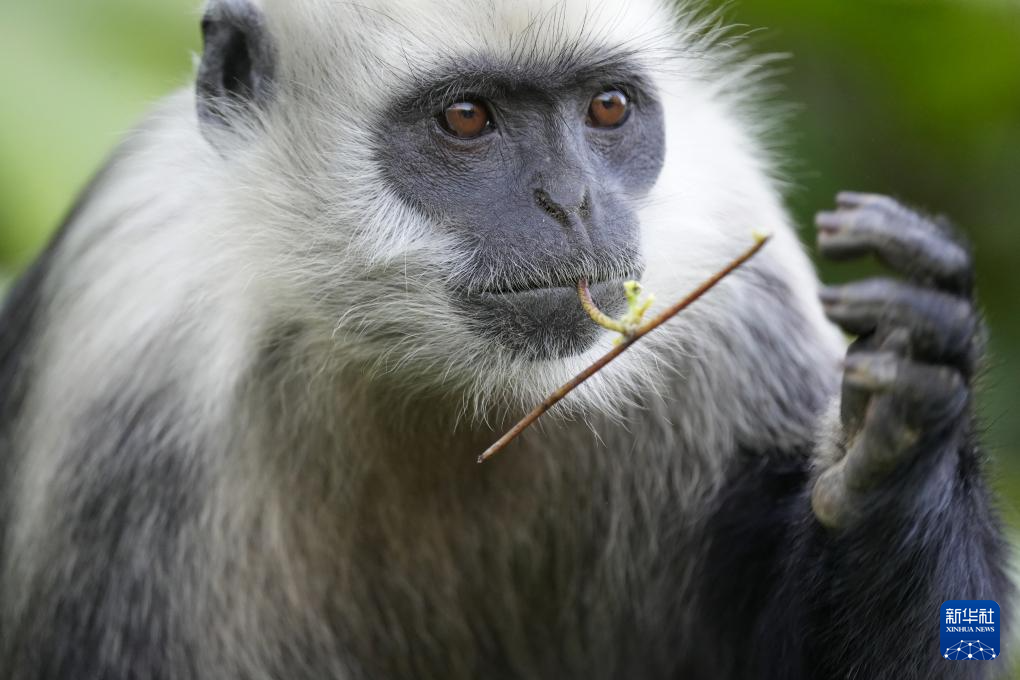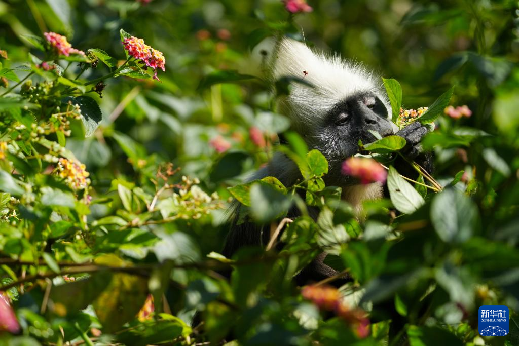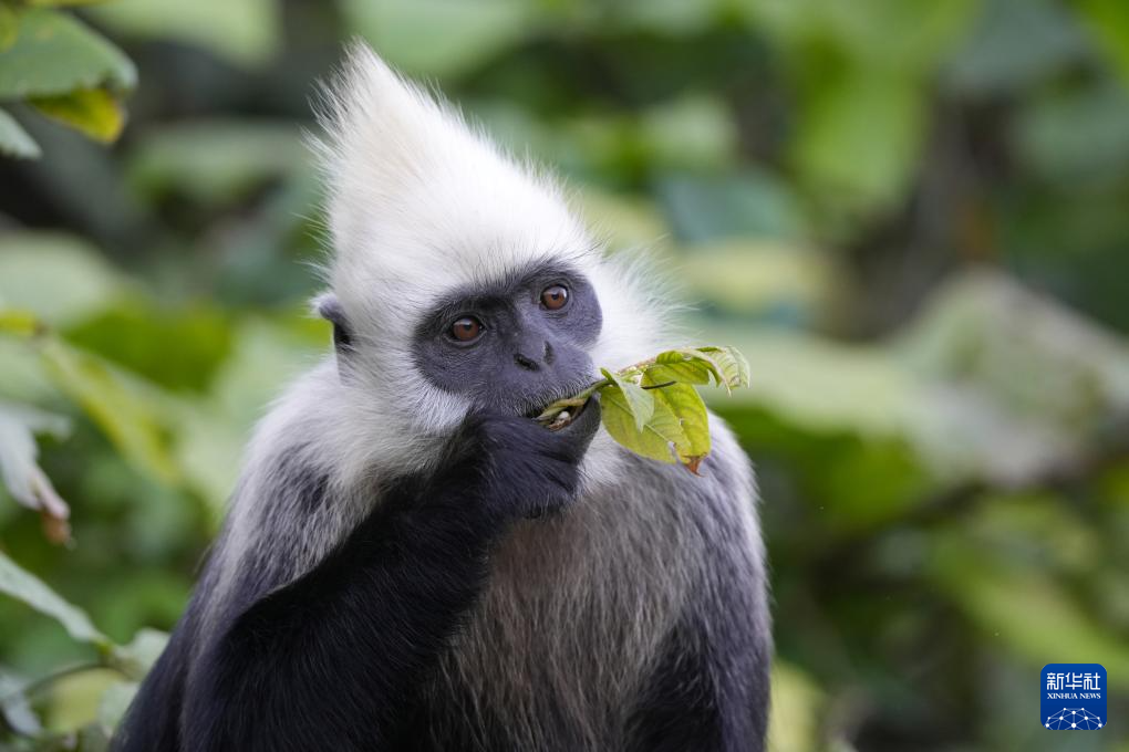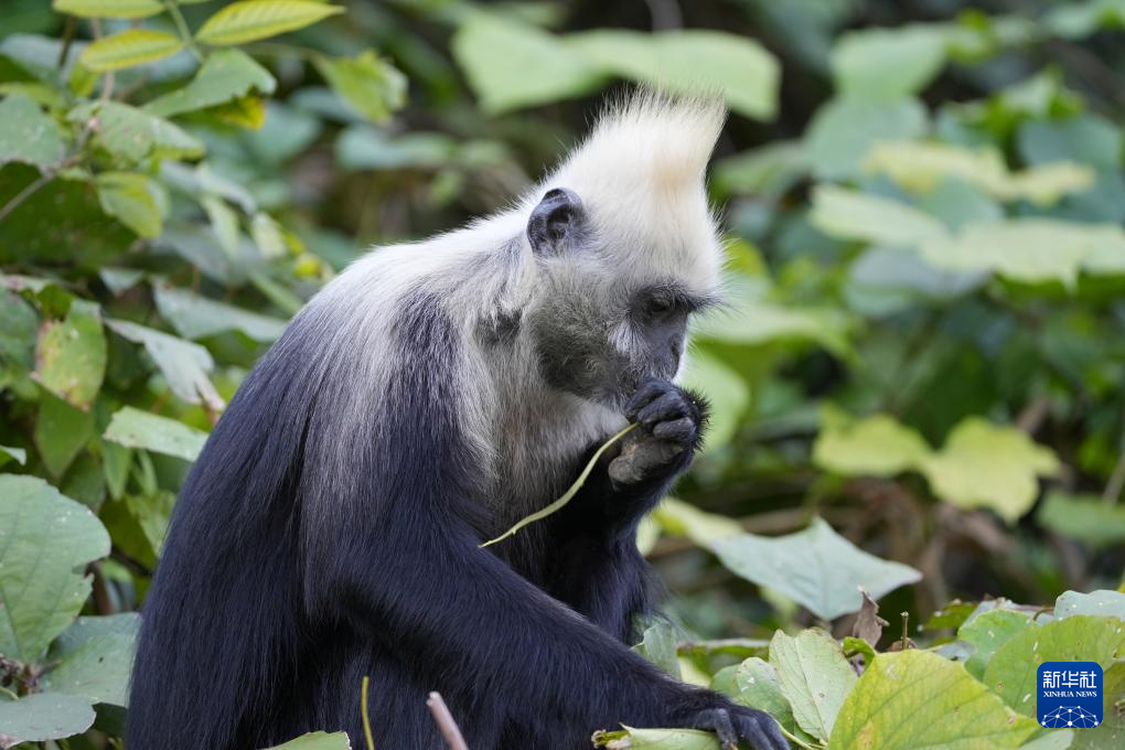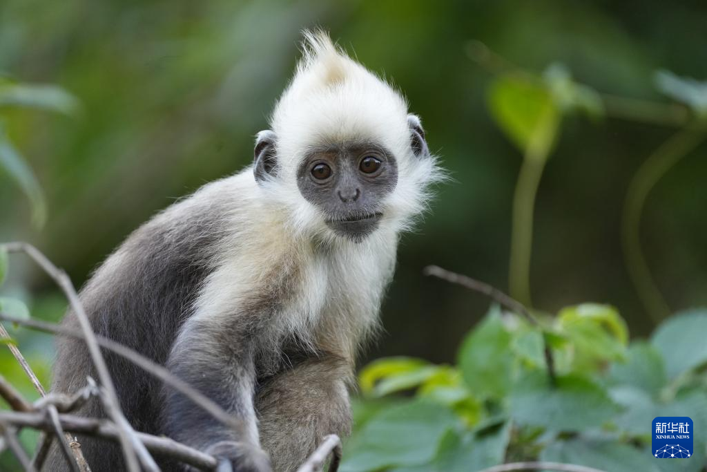 在廣西崇左白頭葉猴國家級自然保護區板利片區,白頭葉猴在茂密的樹林間穿梭覓食,黑白的毛發與綠色的枝葉相映成趣。白頭葉猴是國家一級重點保護野生動物,因頭頂毛發呈白色、以樹葉為食而得名。
