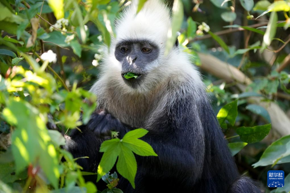 11月27日,在廣西崇左白頭葉猴國家級自然保護區板利片區,一只白頭葉猴在進食。新華社記者 張楓 攝 |