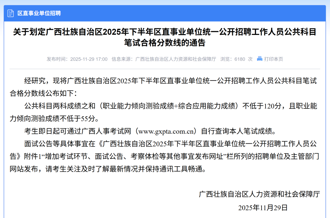 11月29日,廣西人事考試網(wǎng)發(fā)布《關(guān)于劃定廣西壯族自治區(qū)2025年下半年區(qū)直事業(yè)單位統(tǒng)一公開(kāi)招聘工作人員公共科目筆試合格分?jǐn)?shù)線的通告》: 經(jīng)研究,現(xiàn)將廣西壯族自治區(qū)2025年下半年區(qū)直事業(yè)單位統(tǒng)一公開(kāi)招聘工作人員公共科目筆試合格分?jǐn)?shù)線公布如下: 公共科目?jī)煽瞥煽?jī)之和(職業(yè)能力傾向測(cè)驗(yàn)成績(jī)+綜合應(yīng)用能力成績(jī))不低于120分,且職業(yè)能力傾向測(cè)驗(yàn)成績(jī)不低于55分。 考生即日起可通過(guò)廣西人事考試網(wǎng)(www.gxpta.com.cn)自行查詢(xún)本人筆試成績(jī)。 面試公告等具體事宜在《廣西壯族自治區(qū)2025年下半年區(qū)直事業(yè)單位統(tǒng)一公開(kāi)招聘工作人員公告》附件1“增加考試環(huán)節(jié)、面試公告、考察體檢等其他事宜發(fā)布網(wǎng)址”欄所列的招聘單位及主管部門(mén)網(wǎng)站發(fā)布,請(qǐng)考生關(guān)注及時(shí)了解最新情況并保持通訊工具暢通。