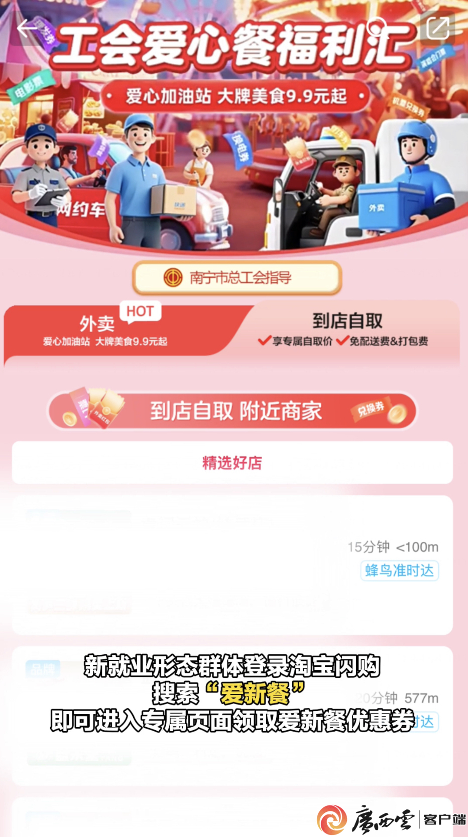 現場向新就業形態勞動者贈送慰問品和“暖新禮包”。通訊員 胡東宇 攝 工作地點不定、工作時間靈活、頻繁“在路上”導致缺乏穩定就餐場所或經常錯過就餐時間;一餐一飯累積起來的開支不小,只能選擇便宜餐食“對付一口”,這是許多新就業形態勞動者來不及、舍不得就餐的現實困境。 為此,南寧市總工會聯合各部門及平臺技術能力、本地商家資源,推出“愛新餐”關懷項目。項目以“專屬人群、專屬入口、專屬商品、專屬補貼”為服務特點,已認證的新就業形態勞動者工會成員,包括騎手、快遞員、網約車司機等,在“淘寶閃購(餓了么)”APP上搜索“愛心餐”,進入專屬頁面,即可選購愛心套餐。套餐價格為10-15元,到店自取還能享專屬自取價,切實減輕新就業形態勞動者用餐成本負擔。