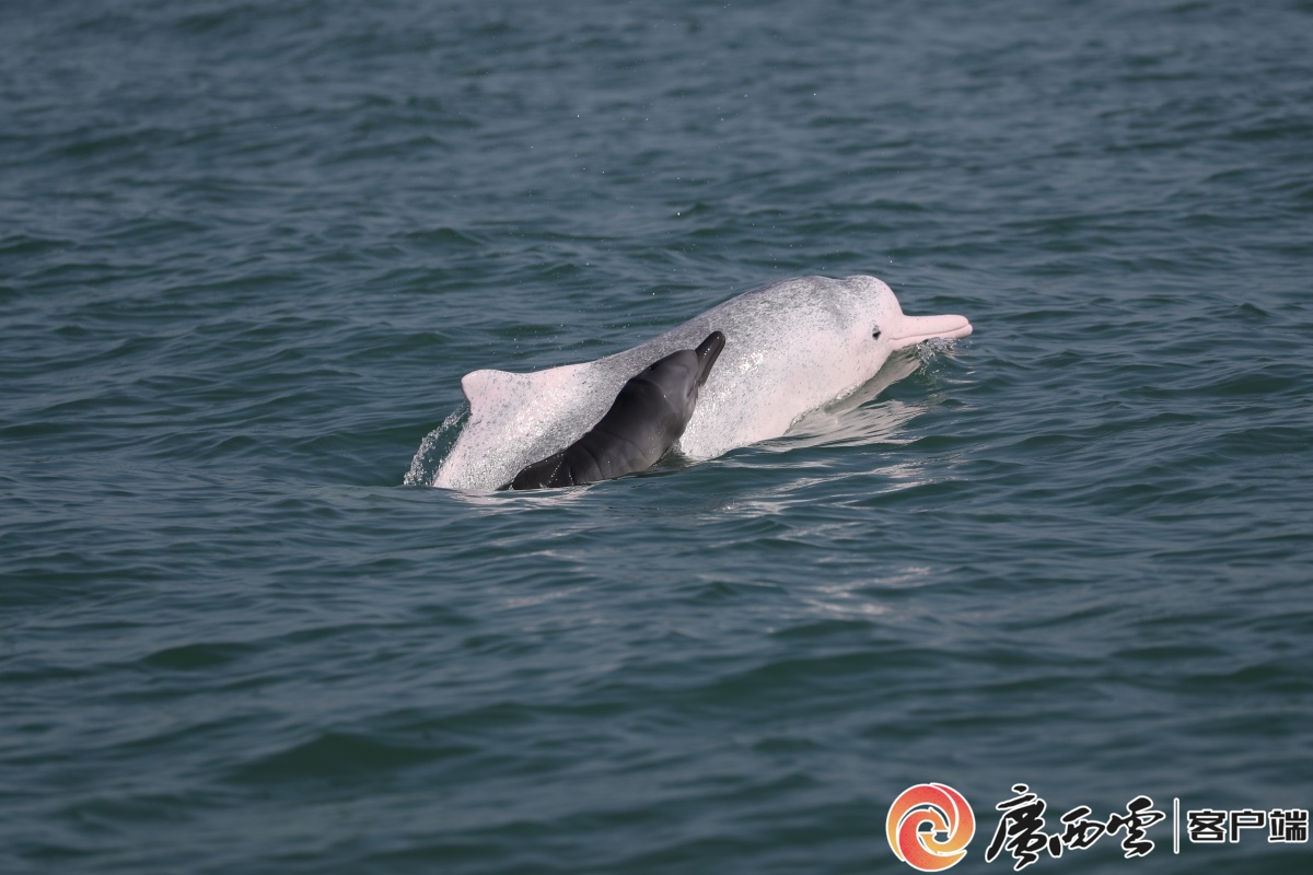 中華白海豚媽媽帶著新生的小海豚在欽州三娘灣海域暢游。趙一 攝 冬日的暖陽灑落三娘灣海面。蔚藍波光中,不時可見一抹粉白的身影悄然躍起——這些充滿靈性的生命,它們的每一次躍動,都是這片大海無言的心跳。 誰不愿意生活在這樣一個充滿生機的世界里呢?