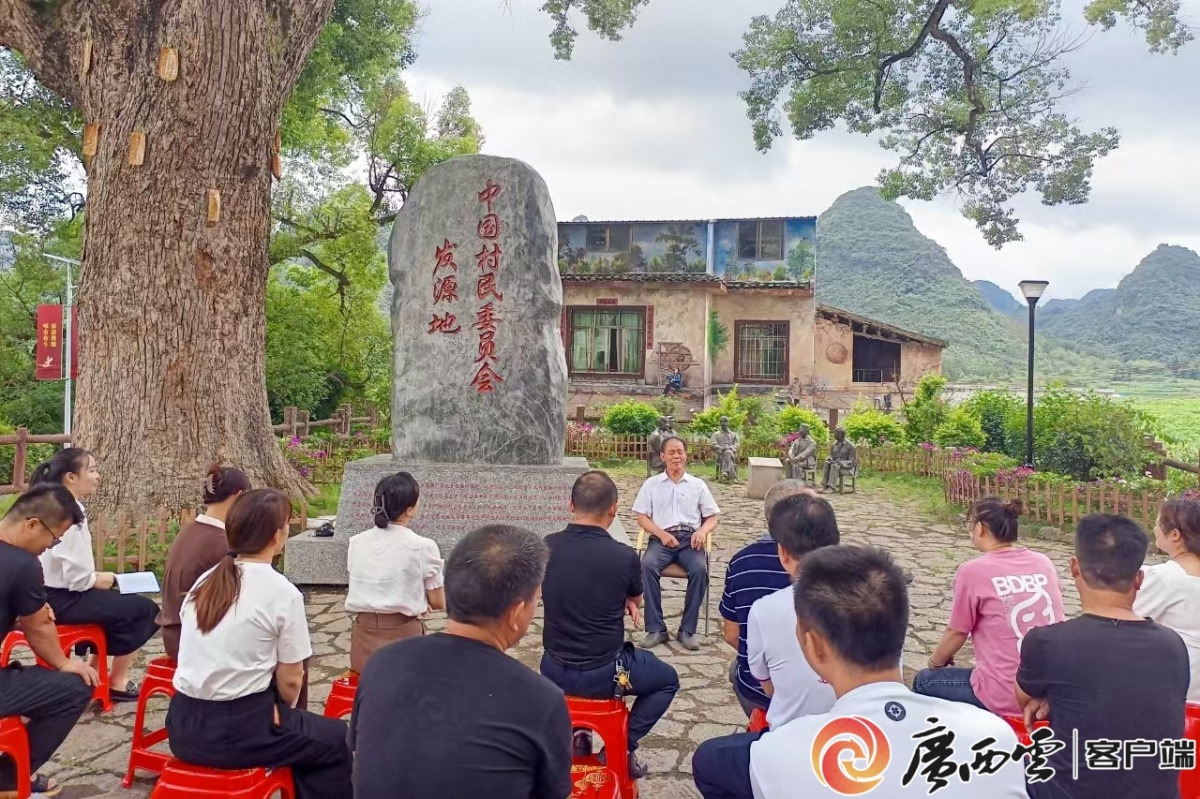 圖為“改革先鋒”韋煥能在“中國村民自治第一村”合寨村內,給組工干部們講述村民自治的心路歷程。 注重用好“線上+線下”相結合方式,打造“行走的組工講堂”。通過“主會場+分會場”視頻系統,舉辦黨建引領鄉村振興等專題網絡培訓,現場教學同步送至全區16個鄉鎮、211個村(社區),帶動鄉鎮黨務干部、駐村干部和村“兩委”干部等1470人次在線學習,確保優質培訓資源全域覆蓋、直通基層。同時,組工干部將《桑蠶產業鏈上建支部》《“三治融合”清潭實踐》等本土優秀案例課程送教到村頭、田間。截至目前,已開展巡回授課15場,現場答復并幫助解決桑蠶食用菌培訓不到位等實際問題107個。