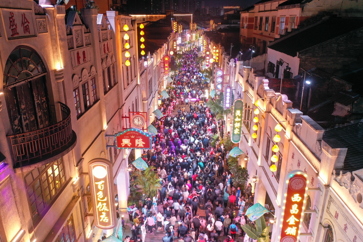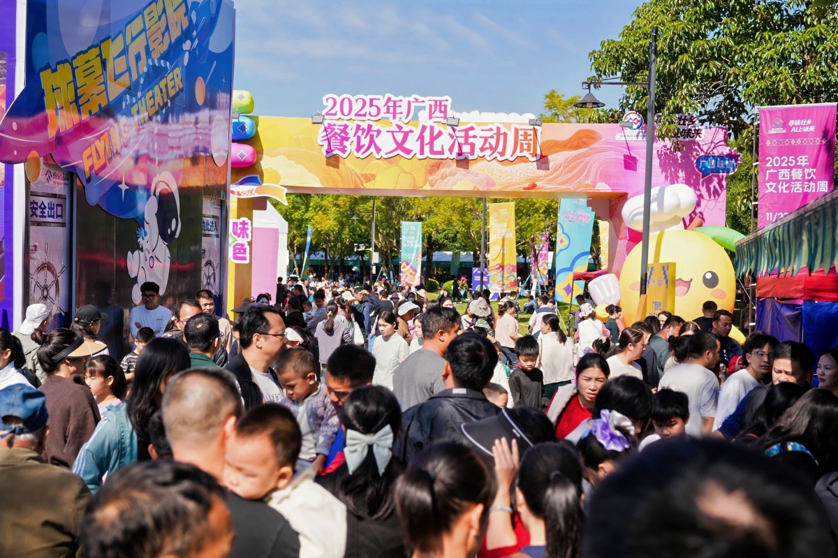 2025年廣西餐飲文化活動周現場。活動主辦方供圖 “步入其中如同置身于‘微縮八桂’,廣西風物、風景、風情盡入眼中,讓人流連忘返。”游客黃先生和朋友邊走邊拍,其樂融融。 魅力不止于此。華燈初上,右江河岸流光溢彩,梵木·百色水岸城燈火璀璨、人頭攢動,夜間消費潛力充分釋放。 作為本屆大會重點建設項目,梵木·百色水岸城串聯起解放街、百通廠、紅軍谷和藝展中心四個各具特色的區域,通過風貌提升改造、新業態引入,將科技光影、非遺瑰寶、紅色記憶與時尚消費融匯在一起,讓百年老街重煥文旅新活力。