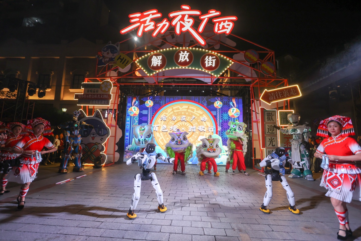 “活力夜廣西”活動現場,機器人展現“拳法”。梁力升 攝 從賞山水之美到品文化之韻,從見證地方新貌到領略科技之光,一系列精彩紛呈的活動既滿足人們對高品質文化旅游體驗的需求,對美好生活的向往,更勾勒出了八桂大地文化旅游高質量發展的新圖景。 開放融合增動能 本次大會不僅是一場可聽可看可玩的文旅盛宴,也是一場擴大交流合作的“營銷會”“投資會”。大會搭建了多層次對話平臺,國內外知名文旅企業、旅行商、投資商等嘉賓齊聚一堂,共商文旅合作、共享發展機遇。 “美麗神奇的廣西,是鑲嵌在北回歸線上的璀璨明珠。這里山川壯美、邊海遼闊,文明久遠、風情獨特,四季如春、花開不敗,是一個有歷史、有人文、有故事的地方。” “‘桂林山水甲天下’舉世聞名;來過廣西的人,多半還要感嘆‘廣西處處是桂林’。但壯美廣西,不止桂林,也不止山水。” …… 大會進行了廣西文旅整體推介和百色文旅專題推介,啟動了“2025廣西旅游年·冬游廣西”主題活動,持續擦亮“秀甲天下壯美廣西”文旅品牌,不斷拓展文旅合作新空間。 “今年1—10月,廣西在線旅游平臺的入境游人次同比增長27%,入境游消費金額同比增長32%。”攜程集團有關負責人在會上表示,隨著雙方合作的深入推進,廣西旅游市場潛力將得到進一步釋放。 中國旅游集團相關負責人范云軍說,“近年來我們在廣西多地積極投資布局,其中運營的德天跨國瀑布景區今年1—10月接待游客218萬人次,同比增長15%,創歷史新高,未來將繼續加強與廣西的交流合作,共繪一幅更加壯美的山水長卷。” 作為大會承辦城市,百色同步舉辦文化旅游產業招商推介會,系統介紹文旅資源稟賦、重點產業布局以及招商政策,并對樂業縣仙霞山旅游度假區等多個重點項目進行了路演展示。