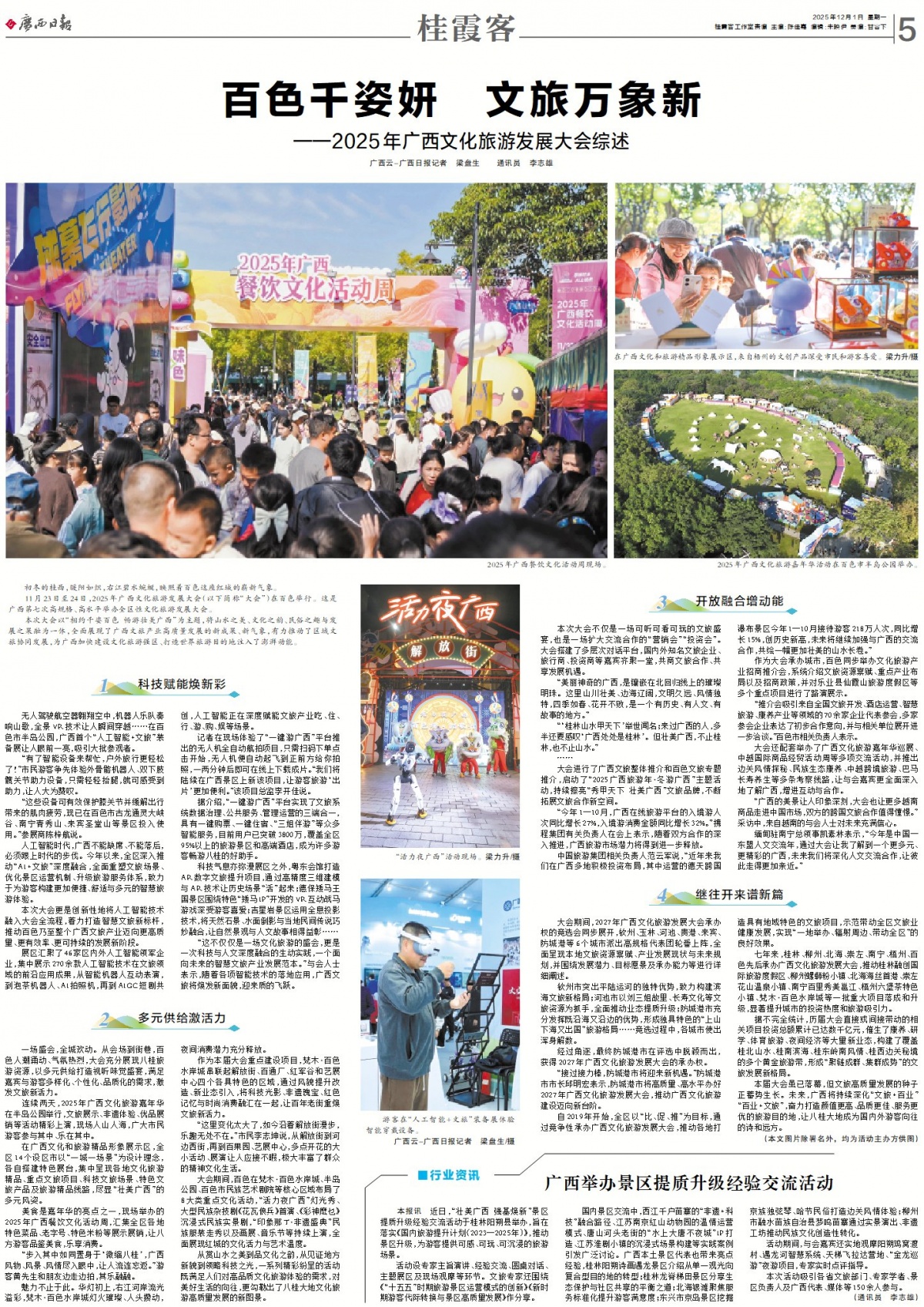 新聞眼初冬的桂西,暖陽如織,右江碧水蜿蜒,映照著百色這座紅城的嶄新氣象。11月23日至24日,2025年廣西文化旅游發展大會(以下簡稱“大會”)在百色舉行。這是廣西第七次高規格、高水平舉辦全區性文化旅游發展大會。本次大會以“相約千姿百色 暢游壯美廣西”為主題,將山水之美、文化之韻、民俗之趣與發展之果融為一體,全面展現了廣西文旅產業高質量發展的新成果、新氣象,有力推動了區域文旅協同發展,為廣西加快建設文化旅游強區、打造世界旅游目的地注入了澎湃動能。 科技賦能煥新彩 無人駕駛航空器翱翔空中,機器人樂隊奏響山歌,全景VR技術讓人瞬間穿越……在百色市半島公園,廣西首個“人工智能+文旅”裝備展讓人眼前一亮,吸引大批參觀者。