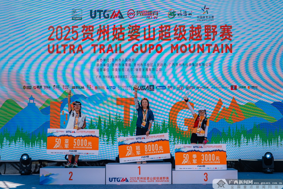 50公里女子組頒獎。賽事方供圖 經過兩天激烈的角逐,100公里男子組崔山堂以11小時41分38秒成績奪得冠軍,彭劍輝、曾根旺分獲二、三名。100公里女子組覃美青以14小時19分14秒成績奪得冠軍,林娟、盧斯分獲二、三名。50公里男子組劉龍健、莫釗宇、林瀟分獲前三名,50公里女子組吳林林、劉潔、何燕分獲前三名。王猛、陳麗鳳分獲25公里組男女冠軍,蔣茂龍、鄧瑩分獲15公里組男女冠軍。