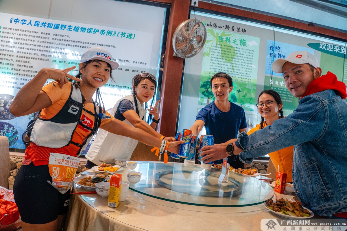 選手們奔跑在姑婆山林間道路上。賽事方供圖 “志愿者的服務真的非常棒,我們一到補給站,他們就會主動詢問是否需要飲料、水等物資,特別貼心。”奪得50公里女子組冠軍后的吳林林難掩喜悅,通過記者的鏡頭,向組委會和沿途志愿者表達了謝意。此次越野賽的沿途補給站不僅提供能量支持,更融入瑤鄉特色美食,讓極限挑戰多了幾分溫情。