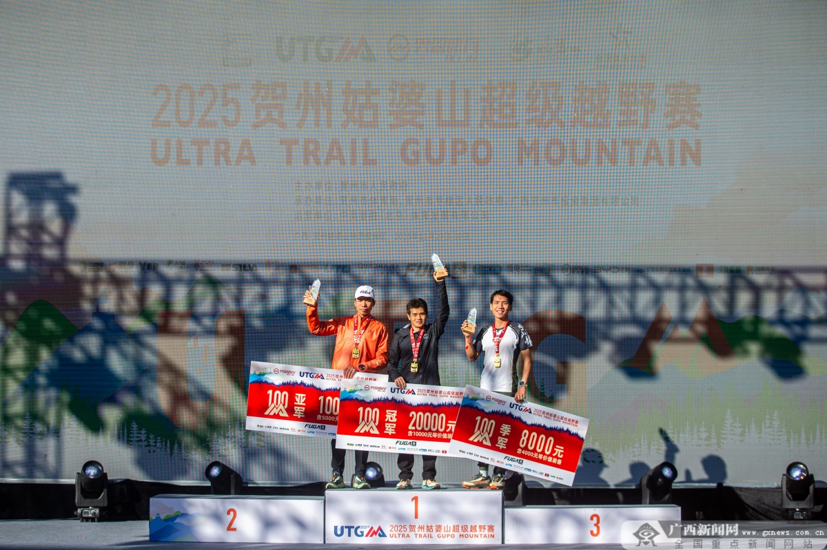 開賽瞬間。賽事方供圖 29日清晨,姑婆山旅游度假區云霧繚繞。隨著發令槍響,選手們沿著串聯景區核心景點的賽道奮勇向前,腳步聲與山間溪流聲、鳥鳴聲交織,縈繞在整個姑婆山。“賽道環境特別好,我還看到了兩只白色的野生鳥類,山間的溪流清澈見底,我還會用溪水降溫。”作為第一次來廣西參賽的選手,來自江西萍鄉的崔山堂對賀州的比賽環境贊不絕口,并表示下次有機會一定會再來。 此次賽道設計充分融合賀州生態優勢與人文特色,選手們在奔跑中穿越茂密叢林,沉浸式感受“中國溫泉之城 世界長壽賀州”的獨特魅力。 在山道上穿梭的參賽選手們。賽事方供圖 100公里男子組頒獎。賽事方供圖