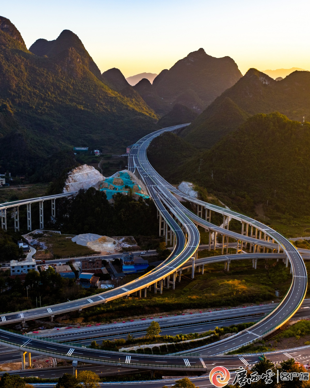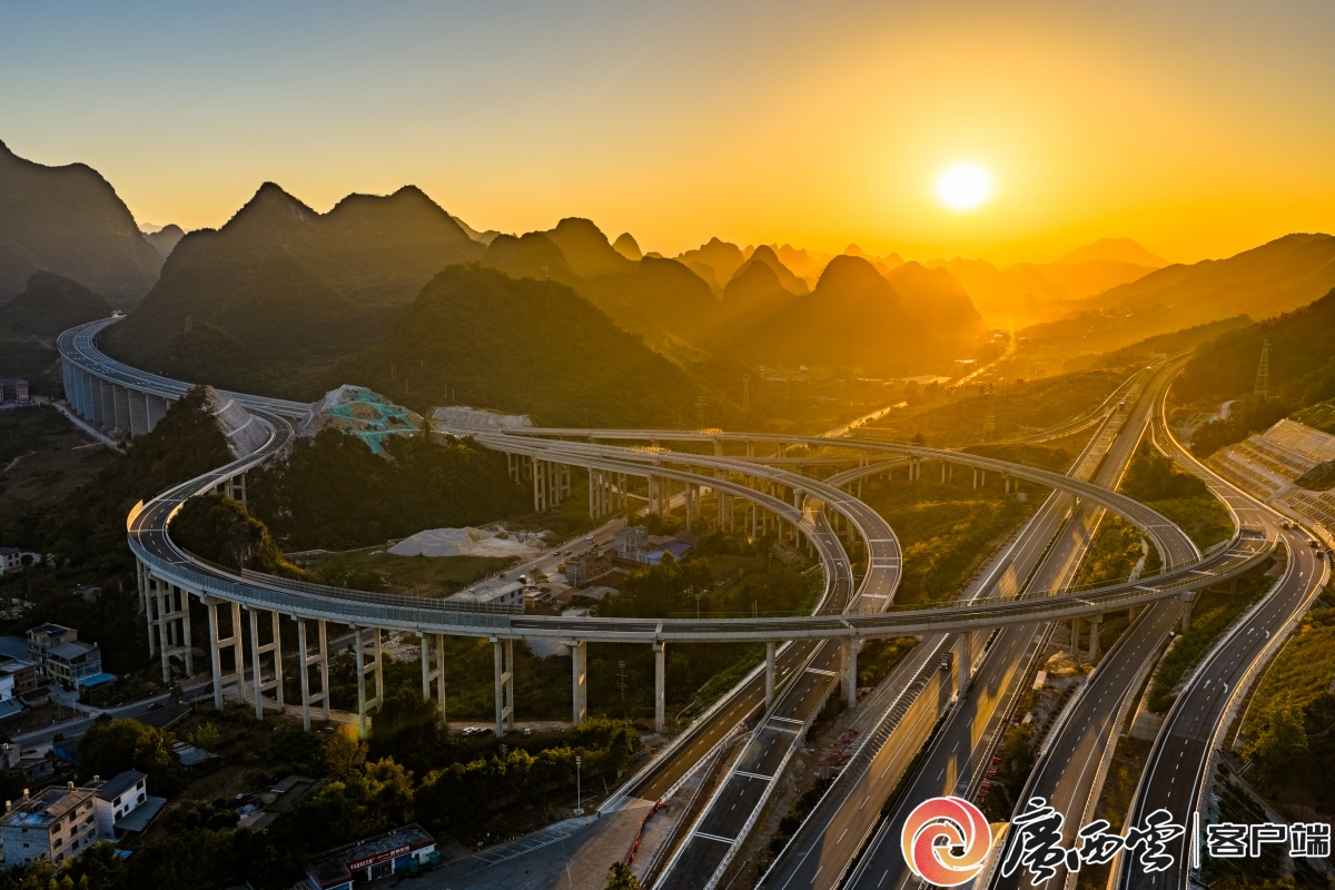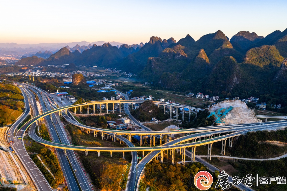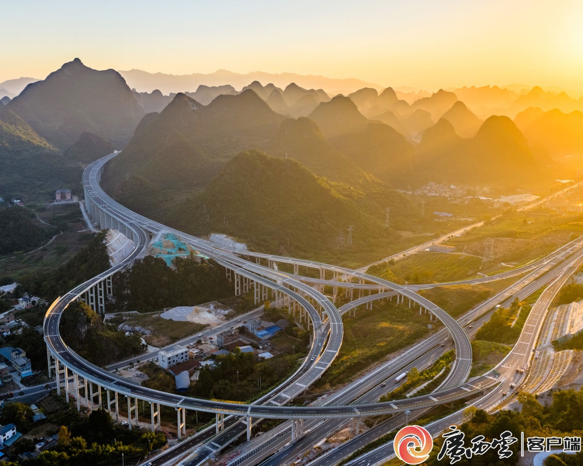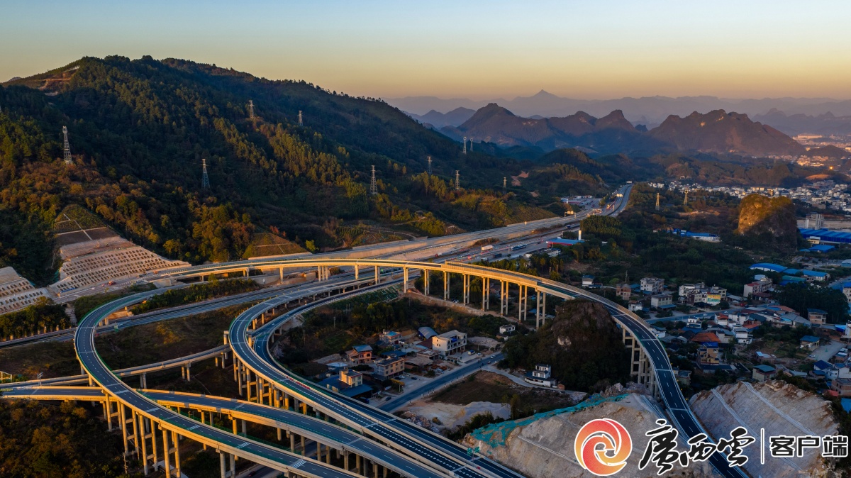 11月29日,桂林市平樂縣平樂東樞紐互通工程順利完成全部主體建設,正式具備通車條件,預計12月26日通車。夕陽余暉中,樞紐互通的交叉高架橋與G65包茂高速公路、G323國道交相輝映,勾勒出桂北大地互聯互通的交通圖景。