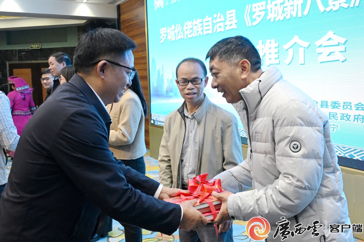 贈書儀式。 推介會現場還通過視頻展示、圖文展板、嘉賓講解等多種形式,全面呈現了羅城作為仫佬族文化發祥地的獨特魅力。從秀美山水風光到濃郁民俗風情,從古老歷史遺跡到現代文旅項目,羅城正以嶄新的姿態迎接八方來客。現場還進行了贈書儀式,羅城縣直單位代表及新書作者代表獲贈新書。 |