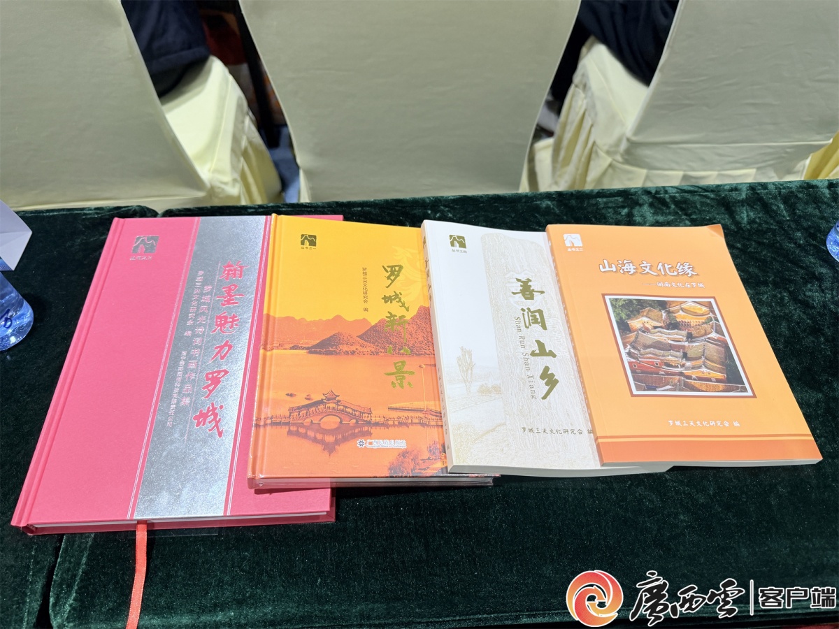 新書展示。 推介會上,羅城相關負責人與新書編委負責人介紹了《羅城新八景》《山海文化緣》《翰墨魅力羅城》《善潤山鄉》等新書的編纂背景、文化價值及其在推動地方文旅融合中的重要意義。羅城三尖文化研究會拓展思路、集思廣益、精心提煉,通過舉辦“三尖羅城、秀美風光”攝影大賽,廣泛征集篩選羅城最美景點景觀,從攝影愛好者投送的963幅攝影作品中,精選出各景點優秀作品,深度挖掘和展示羅城獨特秀美的自然風光。《羅城新八景》是羅城三尖文化研究會推動羅城三尖之一——“山頭尖下有美景”研究的最新成果,選用了30多篇文章和95幅攝影作品。 吳貞儒表示,當前羅城正錨定“文旅康養宜居城”創建目標,依托廉政文化、仫佬文化、三尖文化等特色品牌與“羅城新八景”生態資源,大手筆繪就“兩江(武陽江、劍江)+三湖(成龍湖、燕山湖、美人湖)+酒水”發展新畫卷。全縣以“農文旅”深度融合為抓手推進鄉村振興,重點打造武陽江米椎林景區、劍江天門山景區等特色景點,持續提升成龍湖4A景區等品質,著力建設全國廉政教育基地和仫佬族文化國際旅游目的地,讓綠水青山真正轉化為富民強縣的金山銀山。本次新書發行,既是對羅城絕美風光與人文風采的集中呈現,更為文旅資源推介、“農文旅”深度融合搭建了重要橋梁。