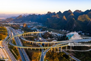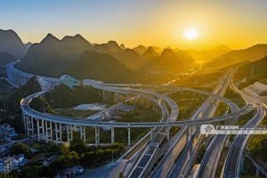 11月29日,桂林市平樂縣平樂東樞紐互通工程順利完成全部主體建設,正式具備通車條件,預計12月26日通車。夕陽余暉中,樞紐互通的交叉高架橋與G65包茂高速公路、G323國道交相輝映,勾勒出桂北大地互聯互通的交通圖景。黃勝林 攝(廣西云-廣西日報)