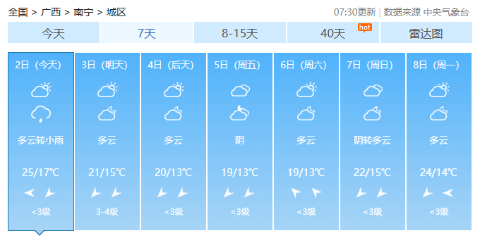 廣西氣象臺預計,2日白天,全區多云轉陰,大部有小雨。最低氣溫:桂北7℃~15℃,桂南14℃~20℃。 受冷空氣影響,大風+降溫+降雨將齊上陣。2日晚至3日白天,全區陰天大部有小雨、局地中雨。高寒山區局地有冰凍和道路結冰。最低氣溫:高寒山區0℃~7℃,桂北7℃~14℃,桂南12℃~19℃。 3日晚至4日白天,全區多云到陰,其中桂西局地有小雨。高寒山區局地有冰凍和道路結冰。最低氣溫:高寒山區-1℃~4℃,桂北5℃~12℃,桂南10℃~15℃。