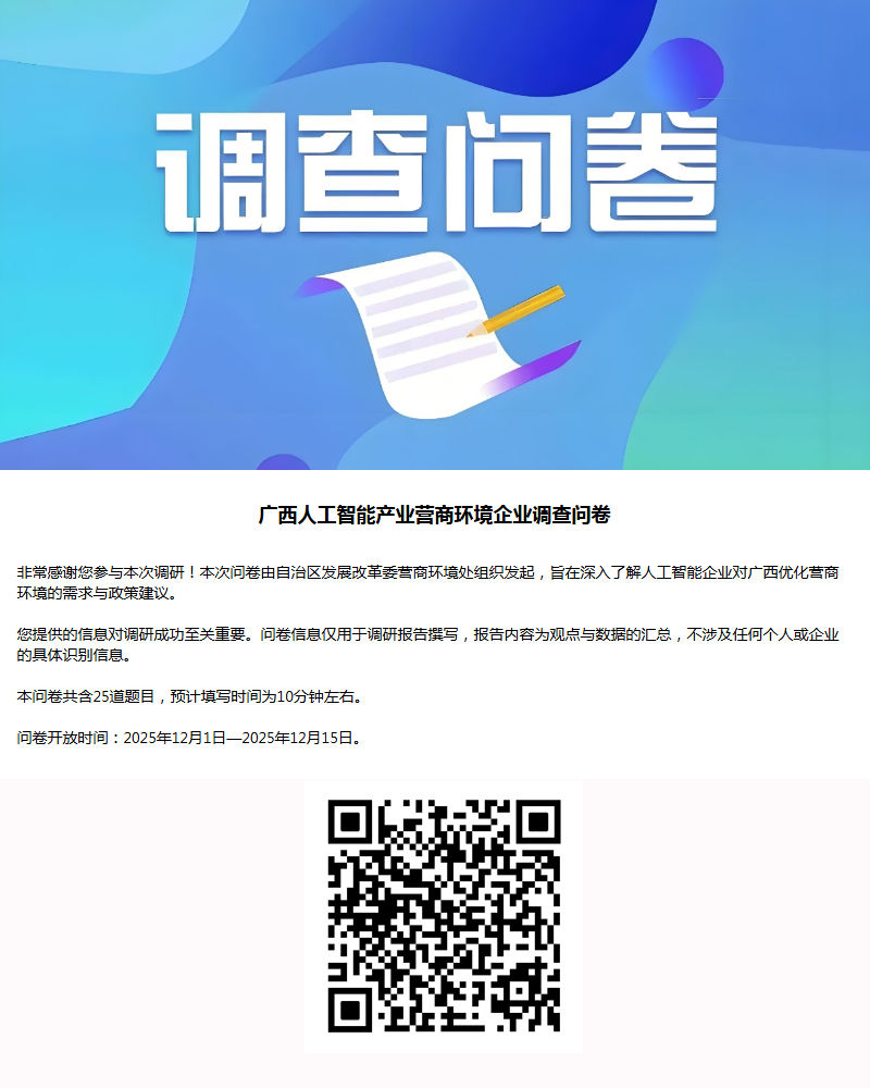 今年以來,廣西陸續出臺《關于加快推動人工智能高質量發展的決定》《廣西“人工智能+制造”行動方案(2025—2027年)》《廣西科技創新支撐“人工智能+”行動工作方案》《廣西優化人工智能產業營商環境若干措施》等系列政策,積極構建“北上廣研發+廣西集成+東盟應用”的特色發展路徑,加快推進中國—東盟國家人工智能應用合作中心建設,著力打造面向東盟的人工智能合作高地。 為全面了解廣西人工智能企業在經營發展中對優化營商環境的實際需求與政策建議,進一步增強惠企助企政策的精準性與實效性,持續營造有利于人工智能產業高質量發展的一流市場環境、創新環境、場景環境、國際環境與政務服務環境,廣西壯族自治區營商環境建設辦公室現組織開展本次問卷調查,面向相關經營主體廣泛征集意見建議。 本次調查問卷所采集的信息僅用于后續調查報告的統計分析。報告內容為觀點與數據的整合呈現,不涉及個人或企業的具體識別信息。問卷填寫約需10分鐘,掃描下方二維碼即可參與。問卷開放時間為即日起至2025年12月15日。