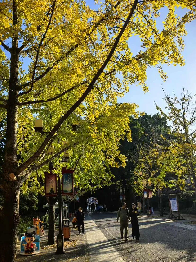 桂林市民在漓江邊義務(wù)植樹種下的烏桕已經(jīng)成景。通訊員 李騰釗 攝 銀杏金黃添雅韻 城鄉(xiāng)各處皆可賞 除了熱烈的紅色,金黃的銀杏無(wú)疑是初冬的主角之一。在桂林,無(wú)論是公園景區(qū)、城市街道,還是小眾秘境,都能尋覓到銀杏的絕美身影。 公園景區(qū)是賞葉的經(jīng)典之選,山水與銀杏相映成趣,別有一番韻味。近日,記者走進(jìn)南溪山公園看到,成片的銀杏樹與公園內(nèi)的山水、亭臺(tái)樓閣相互映襯,盡顯古典韻味。