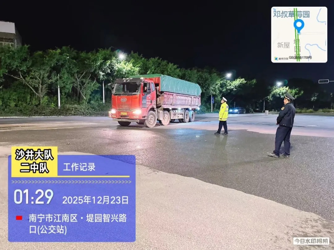 巡查整治。圖片來源:江南區綜合行政執法局 針對凌晨貨運集中時段,江南區在三津大道等核心路段設置重型柴油貨車繞行管控點,聯合南寧市交警五大隊嚴查密閉運輸不到位、遺撒泄漏、帶泥上路等違規運輸行為,嚴控道路揚塵污染。常態化巡查在建工地“六個百分百”防塵措施落實情況,對揚塵違規行為從嚴查處、限期整改。加大環衛保潔作業力度,開展灑水降塵、機械化清掃作業,全面提升道路保潔降塵水平,持續改善轄區空氣質量。 |