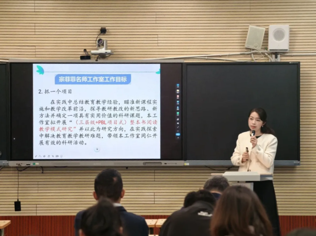 名師引領(lǐng),構(gòu)建育人新范式 工作室主持人宗菲菲作了《思政鑄魂 名師領(lǐng)航——南寧市宗菲菲名師工作室的育人實踐與探索》專題講座,系統(tǒng)闡述了工作室以“三層級+PBL項目式整本書閱讀”為路徑,將思政教育無痕融入學(xué)科教學(xué)的實踐模式。她強調(diào),工作室通過“示范課堂領(lǐng)航”“青年教師分組研磨”“區(qū)域輻射送教”三大機制,推動教師從“教學(xué)執(zhí)行者”成長為“育人設(shè)計師”。