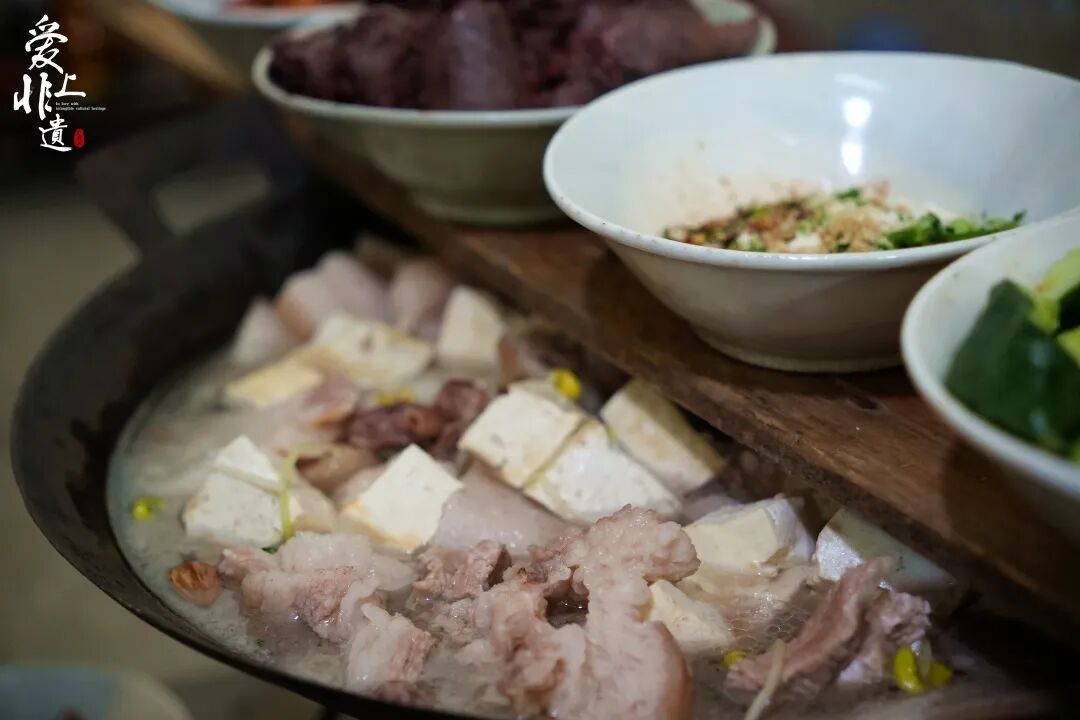 制作袍湯。廣西云-廣西日報記者 甘艷霞 攝 祭祖后,便是制作袍湯。袍湯,是取本地土豬身上的各部位豬肉與內臟作為原料,下入由八角、桂皮等香料與排骨熬煮的湯中,加入豆腐、豆芽等食材烹煮而成的隆林特色菜肴。湯鮮味美,肉質軟爛,是屬于隆林漢族冬日中的“一碗”特殊的溫暖。