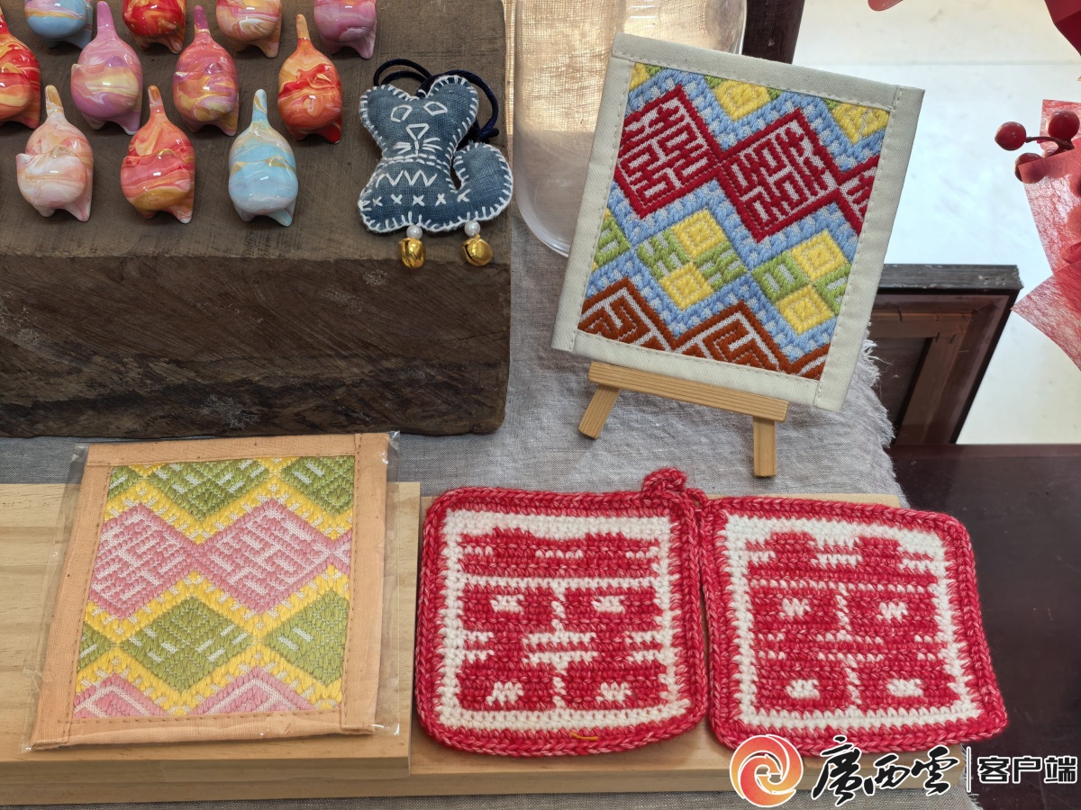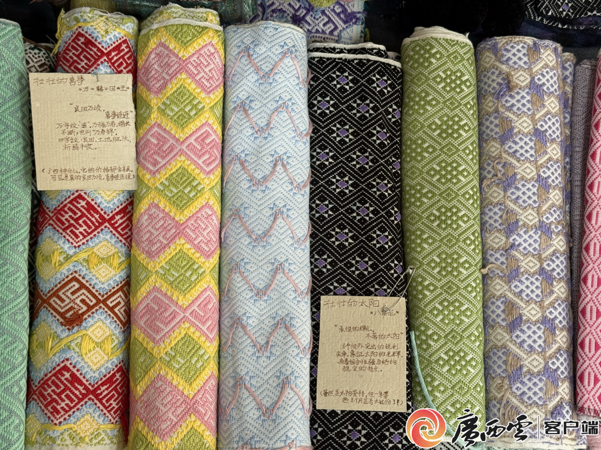 地鐵站出入口的壯錦紋樣。 所謂紋樣,既糅合天地草木與人文信仰,又凝聚刺繡、蠟染、銀飾鍛造等多重傳統技藝。繡片的針線穿梭、器物的冶鑄捶打、建筑的雕梁畫棟,讓紋樣變得更加鮮活。這些紋樣,不僅是區分民族身份的鮮明標識、維系文化傳承的堅韌紐帶,更是廣西多民族融合共生的生動見證。讀懂這一幅幅直觀可感的紋樣,便讀懂了廣西各族人民對生活最真摯的熱愛與對未來最懇切的期許。 老紋樣玩出新花樣 文化傳承,始終要靠人來堅守。在廣西紋樣的傳承路上,總有兩種力量并行:一種是老輩藝人對技藝與文化內核的堅守,守住紋樣的根;一種是年輕一代對表達形式與傳播渠道的創新,拓寬傳承的路。 “這個動物紋很俏皮,我們是不是可以嘗試搭配幾何紋樣,看看效果?”1月10日,位于橫州市茉莉花大道上的橫田織染工作室里,27歲的壯錦手藝人羅紫涵正和團隊討論馬年新品設計。 羅紫涵與紋樣的結緣,源于奶奶的啟蒙:“我奶奶做剪紙、織錦、刺繡都非常厲害,小時候我常常跟在她身邊,跟著她做手工活。”這份童年記憶,成為羅紫涵日后投身壯錦傳承的重要鋪墊。大學修讀工藝美術專業的她,畢業后曾在杭州從事設計工作,一年后選擇返回橫州,在母親和姑媽的引導下學習壯錦技藝。憑借專業積累和童年熏陶,她很快就掌握了基礎技法,進度遠超預期。 “壯錦是一種織造技藝,也是民族紋樣的延續。”在她看來,紋樣不應局限于傳統形態,基于這一理念,她開啟了對壯錦紋樣的探索。 羅紫涵從最直觀的顏色調整入手,選用符合現代年輕人審美的色彩搭配,讓傳統紋樣有了創新的表達。在產品形態上,她也進行了大膽改造,例如將傳統繡球硬的質感改成軟的,讓它變得更可愛。再把繡球外面的流蘇改成毛絨球,可愛嬌憨的模樣,更貼近年輕人喜好。她還將八角花紋、谷穗紋融入服裝、箱包、飾品,開發出亞克力杯墊、紅包、發圈、包掛等文創產品,讓紋樣以更輕盈、更貼近生活的方式觸達大眾。