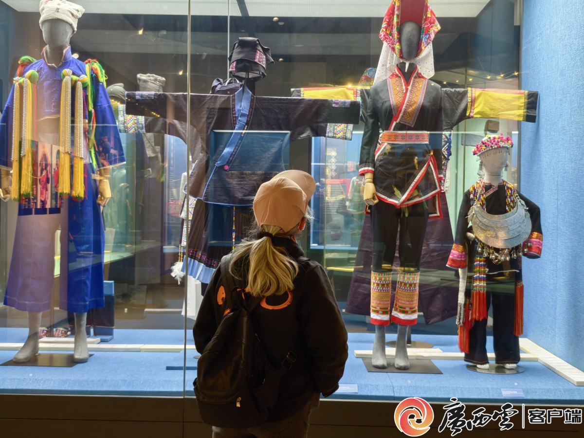 觀眾在廣西民族博物館參觀民族服飾。 傳統紋樣題材多樣、種類豐富,人們對孩童的疼愛、對團圓的向往、對幸福的定義,都有對應的紋樣記載。它讓個人情感得以公共表達,讓個體的生命時刻與族群的集體記憶緊密相連。 在廣西各民族的文化符號譜系中,除了服飾上的繡紋,銅鼓上的紋飾同樣是民族智慧的璀璨結晶,與針線織就的紋樣共同訴說著先民的生活愿景與文化信仰。 作為廣西標志性的古代器物,銅鼓上的紋飾包羅萬象:太陽紋光芒四射,象征著光明普照、生機永續;蛙紋形態憨拙,寄托著各族群眾對風調雨順、族群繁衍的期盼;羽人紋栩栩如生,再現了先民祭祀、勞作、歌舞的熱鬧場景。銅鼓研究專家梁燕理表示,銅鼓上的紋飾就像一座無比豐富的資料寶庫,儲存著我國南方民族古代社會的大量信息,堪稱一部民族歷史百科全書。 博物館的展柜,恰似記錄紋樣的時光膠囊,讓人得以窺見紋樣的演變軌跡與民族融合的深刻印記。漫步街巷你更會發現,紋樣元素的應用早已融入日常:南寧地鐵站出入口的壯錦幾何紋、吳圩機場高鐵站候車大廳的銜魚翔鷺紋,就連街道邊的石墩上,都能見到靈動的人形紋、動物紋。