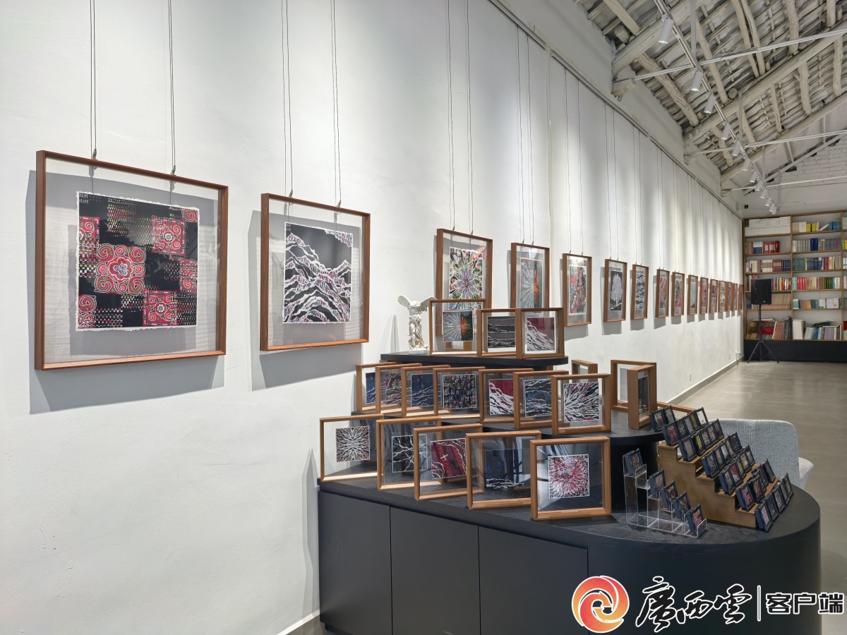 身著壯錦服飾的模特陸仙人。 社交網絡上,河池青年服裝設計師潘英妮設計的壯錦背心火到了國外。她為一對情侶定制的壯族服飾,讓廣西紋樣出現在意大利街頭。博物館里,紋樣結合潮玩做出了新花樣。游客在廣西博物館甌駱工坊為玩偶LABUBU定制的壯錦娃衣,讓全國網友都感到驚艷。 一張照片、一個視頻,讓承載吉祥寓意的民族紋樣飛向世界各地,形成了“行走的文化科普”,更多人由此看到:民族紋樣的發展,就是要讓更多人參與進來,把紋樣融入千姿百態的生活,才能飛得更高、走得更遠。 數字紋樣“云上備份” 如果說傳承人的堅守與創新讓紋樣活在當下,那么數字技術的賦能,則讓紋樣的傳承與傳播擁有了更廣闊的未來。 年初,南寧市友愛路39號谷金藝術空間里,一場名為“紋樣山河”的數字繪畫展覽吸引了人們的目光。展出的作品中,民族紋樣經數字技術切割、重組、疊合后,化作起伏的山巒、縱橫的田壟、奔涌的河流。與常見作品展不同,這里沒有過多的文字注解,甚至單幅作品也沒有標題,觀者的目光全然聚焦于紋樣本身。