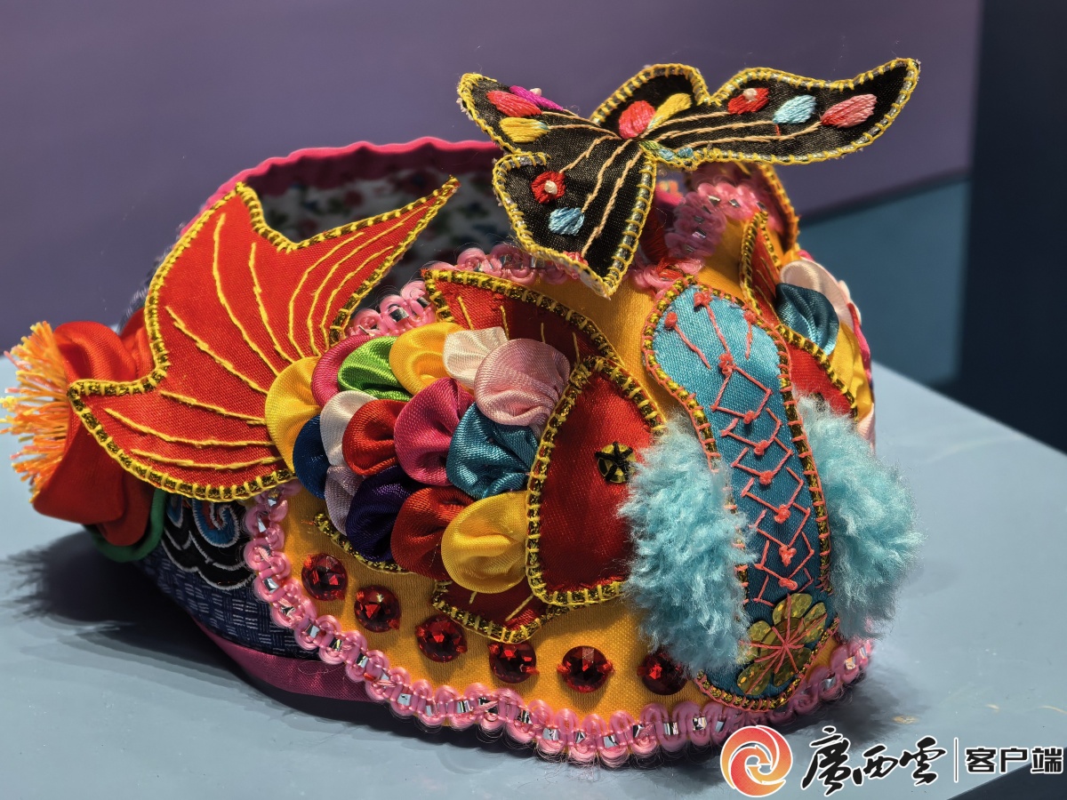 佩戴金魚帽的女童。李彩蘭 攝 方寸之間收納祝福 “你看這帽檐的花紋繡得真精致!這頂還繡著‘金玉滿堂’四個字。”日前,“我的帽子會說話——廣西傳統童帽文化展”在廣西民族博物館開展,上百頂來自壯、瑤、苗、侗等民族的童帽錯落陳列,色彩明艷的紋樣在童帽上鋪展,或靈動鮮活或古樸厚重,引得游客駐足品評、輕聲贊嘆。 方寸帽檐間,紋樣的祈福寓意被展現得淋漓盡致。植物紋寄寓安康,動物紋祈愿平安,金瓜飾物藏著“猴抱金瓜”的民俗雅趣。“女孩戴的金魚帽除了繡有金魚,還有蝴蝶、花朵,祝愿她如花般俏麗、人見人愛;男孩戴的金魚帽則綴有小鳥,希望他未來能展翅高飛、前途無量。”開展首日,自治區級非遺項目凌云壯族兒童配飾制作技藝代表性傳承人李彩蘭手持針線現場講解,她提到百色凌云有一項傳統習俗:長輩會為滿周歲孩童送上金魚帽與虎頭鞋,以“金玉滿堂”“護佑平安”的寓意傳遞祝福。
