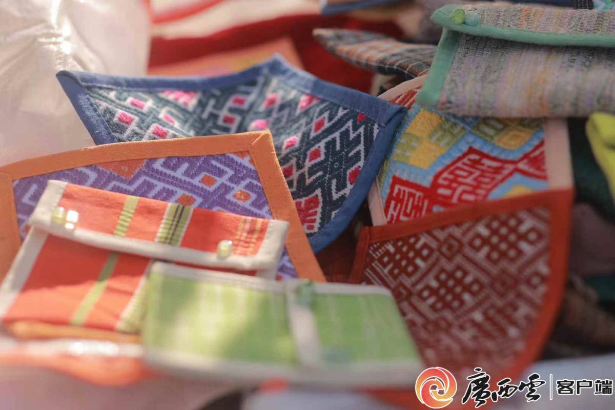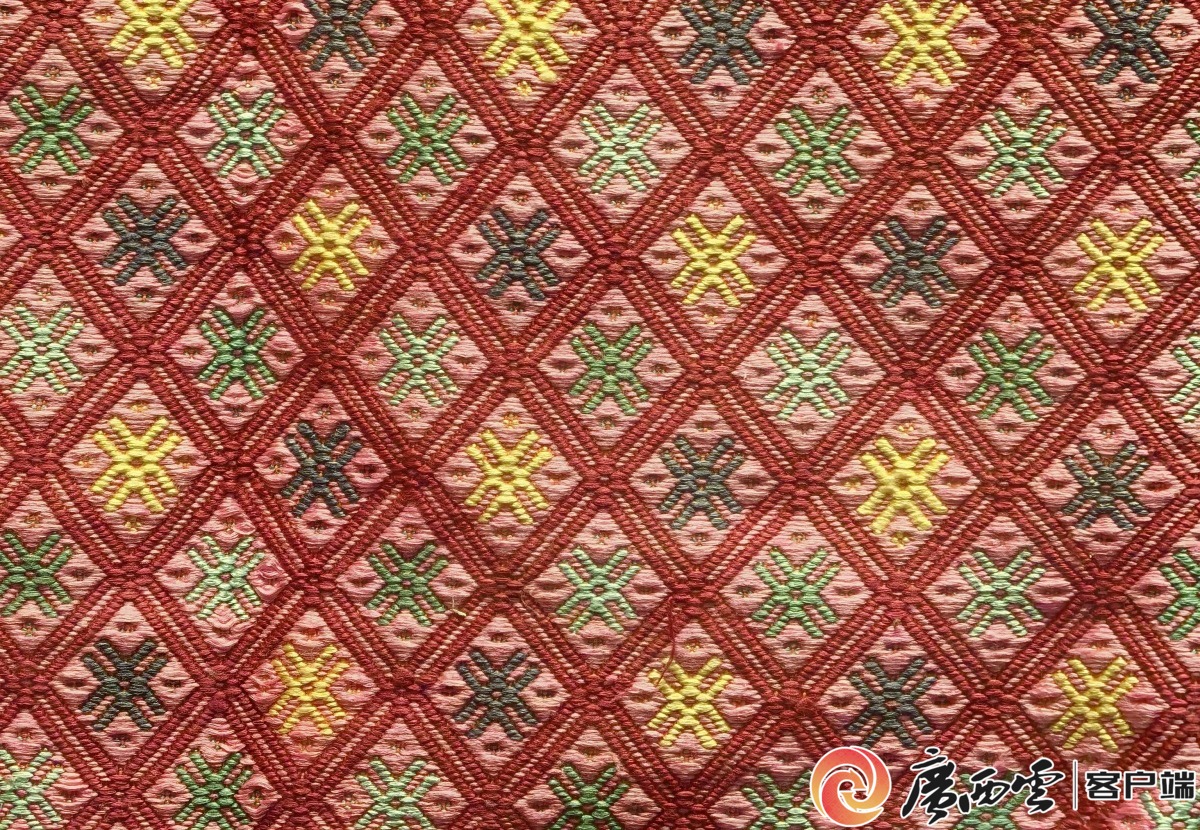百色凌云壯族女童金魚帽。 看似小巧的金魚帽,融合了繪畫、布貼繡、配色等多重技藝,就連帽上魚鱗圖案的大小和排布也頗有講究。“這是給孩子戴的,細節容不得半點馬虎。”李彩蘭一邊演示刺繡手法,一邊向圍攏的親子家庭傳授技藝,面對大家的學習熱情,她表示:“我做的不僅是童帽,更是在傳承老祖宗的紋樣與手藝。” 從童帽的方寸紋樣延伸開去,廣西各民族自古就有“好五色衣裳”的風尚,服飾的領口、袖口、胸襟等關鍵部位,總能見到織錦或刺繡紋樣的身影,這也成為民族文化最直觀的外在表達。壯族服飾上的繡球紋,源自傳統拋繡球習俗,既象征愛情團圓,更暗含“團結聚合”的民族精神;稻穗紋則呼應著壯族“稻作民族”的身份,承載著先民對豐收的向往。瑤族女子喜歡將方形、菱形等幾何紋繡在被面、床單、背帶等生活用品上,兼顧美觀與實用,把對美好生活的期許寄托其中。90后瑤族女孩李紅梅告訴記者,她結婚時收到的傳統幾何紋被面,便是姑姑親手織就的,“這紋樣陪著我成家,就像帶著家人的祝福。”