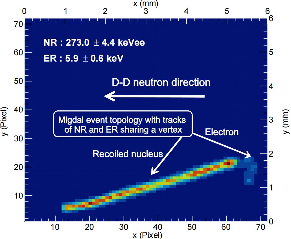 探測器結構與工作原理。 米格達爾(Migdal)效應是1939年蘇聯科學家Migdal通過量子力學計算,預言當中性粒子與原子核碰撞時,反沖原子核將部分能量傳遞給核外電子。一個原子的原子核突然獲得能量(例如:α衰變,β衰變,中性粒子碰撞)加速運動時,原子核在反沖過程中的內部電場變化將部分能量轉移給原子核外電子,使電子有概率獲得足夠能量脫離原子束縛,形成帶共同頂點的兩條帶電徑跡(核反沖徑跡和電子徑跡)。