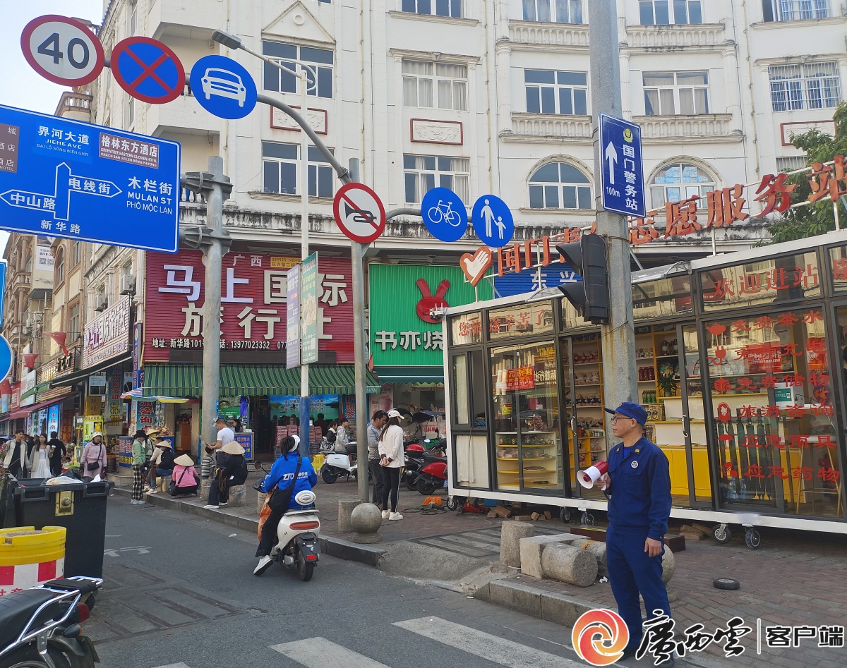 在甘蔗地,宣傳員向勞作的群眾科普消防知識。 京族話“響”徹國門景區 東興國門景區是防城港市的特色旅游景點,每天都有大量游客前來參觀游覽。為了增強游客和當地居民的消防安全意識,宣傳員隆壯文專門錄制了京族話版消防提示。在國門景區,隆壯文拿著大喇叭走街串巷,用京族話向大家宣傳消防知識!案魑挥慰团笥,歡迎來到東興國門景區,在游玩的同時要注意消防安全,自覺將車輛停放在規定區域,不要占用疏散通道、安全出口……”京族話獨特的語調吸引了眾多游客的目光,大家紛紛圍過來聆聽。 宣傳人員隆壯文還走進景區內的商鋪,向商家發放消防宣傳資料,并用京族話講解商鋪消防安全注意事項。一位經營紀念品商店的老板表示:“這種用京族話宣傳的方式很好,讓我們感覺特別親切,也讓我們更加重視消防安全了!