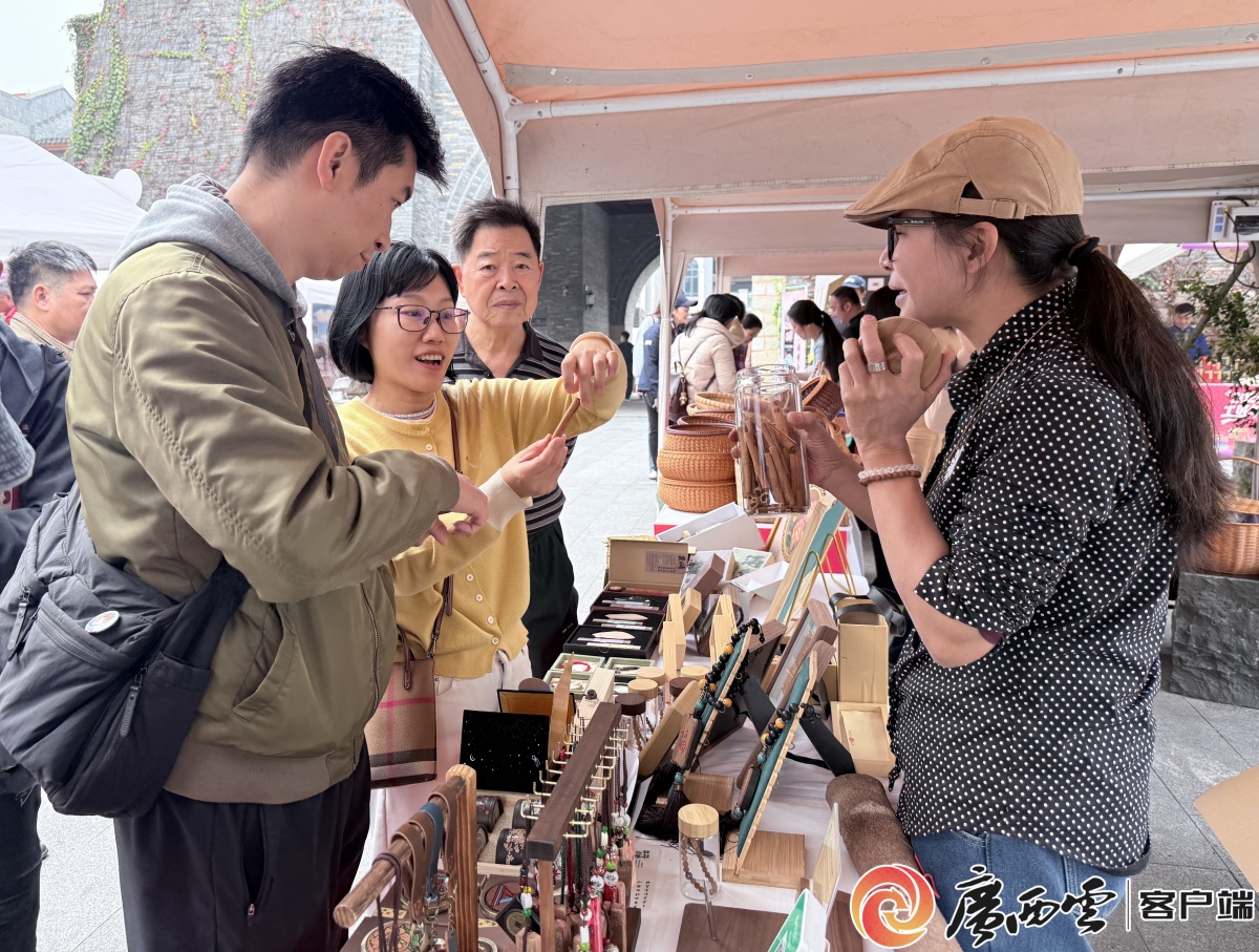 2026廣西鄉(xiāng)村工匠年貨集市活動啟幕。記者 楊靈燁 攝 1月17日上午,伴著洪亮激昂的鼓聲,大集正式開市,一個個展銷區(qū)琳瑯滿目,漆器柚罐、堆繡繡球、手工盆景、桂皮雕刻、石頭畫等傳統(tǒng)絕活好物紛紛亮相,顧客嘆為觀止,還有南寧年糕、北海沙蟹汁、橫州茉莉花茶等各地風(fēng)味讓觀眾垂涎。 匠心好物云集。記者 楊靈燁 實習(xí)生 鐘簡 攝制 “兩手空空地來,兩袋滿滿而歸,這個集市太好逛了,好多東西適合買來過年送禮!笔忻裨繕泛呛堑叵蚝糜逊窒碜约禾缘降摹皩毑亍薄 顧客被非遺東興桂皮雕刻吸引。記者 楊靈燁 攝 除了購好物,在這個年貨集市,還有一場特別的互動——廣西鄉(xiāng)村工匠技藝傳習(xí)活動,20組親子家庭在這里開啟沉浸式的非遺體驗課堂。繡球制作區(qū)內(nèi),技藝嫻熟的繡娘們現(xiàn)場傳授針法并講解圖案寓意,親子協(xié)作下,一個個精美繡球逐漸成型。古建筑模型制作區(qū)則成為“活態(tài)課堂”,工匠師傅們解析榫卯結(jié)構(gòu)原理,指導(dǎo)學(xué)生和家長拼裝模型,讓非遺技藝的智慧與美感在親手實踐中得以領(lǐng)會。 學(xué)生向繡娘學(xué)習(xí)制作繡球。記者 楊靈燁 攝 “這是我親手搭建起來的房子,很有成就感,長大后我想用這項技藝蓋一座新學(xué)校。”一名學(xué)生激動地向記者分享道!昂⒆硬粌H學(xué)到了工匠手藝,還找到了自己感興趣的方向,這是我們參加這場活動最大的收獲!逼浼议L也開心地說道。