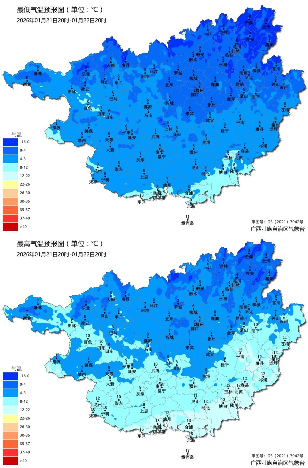 19日20時至22日20時廣西最高、最低氣溫預(yù)報圖 未來三天廣西各地降溫劇烈 22日將是最寒冷的一天 桂南大部地區(qū)最高氣溫 將降至7~15℃ 桂北大部地區(qū)只有3~7℃ 最低氣溫更是低到零下 高寒山區(qū)-7~-1℃,桂北-1~4℃ 桂中4~7℃,桂南7~11℃ 強(qiáng)冷空氣持續(xù)影響 桂東部分地區(qū)及沿海將有5~6級 陣風(fēng)7~8級偏北大風(fēng) 北部灣海面風(fēng)力達(dá)5~6級、陣風(fēng)7~8級 大風(fēng)+降溫帶來風(fēng)寒效應(yīng) 體感更冷 未來幾天天氣復(fù)雜多變 氣溫更是跳崖式下降 請大家及時添衣保暖 避免因氣溫變化引發(fā)的感冒 或誘發(fā)基礎(chǔ)疾病加重 特別是做好老人、兒童等易感人群的防護(hù) 天氣寒冷使用天然氣或炭火取暖時 保持開窗通風(fēng) 謹(jǐn)防一氧化碳中毒