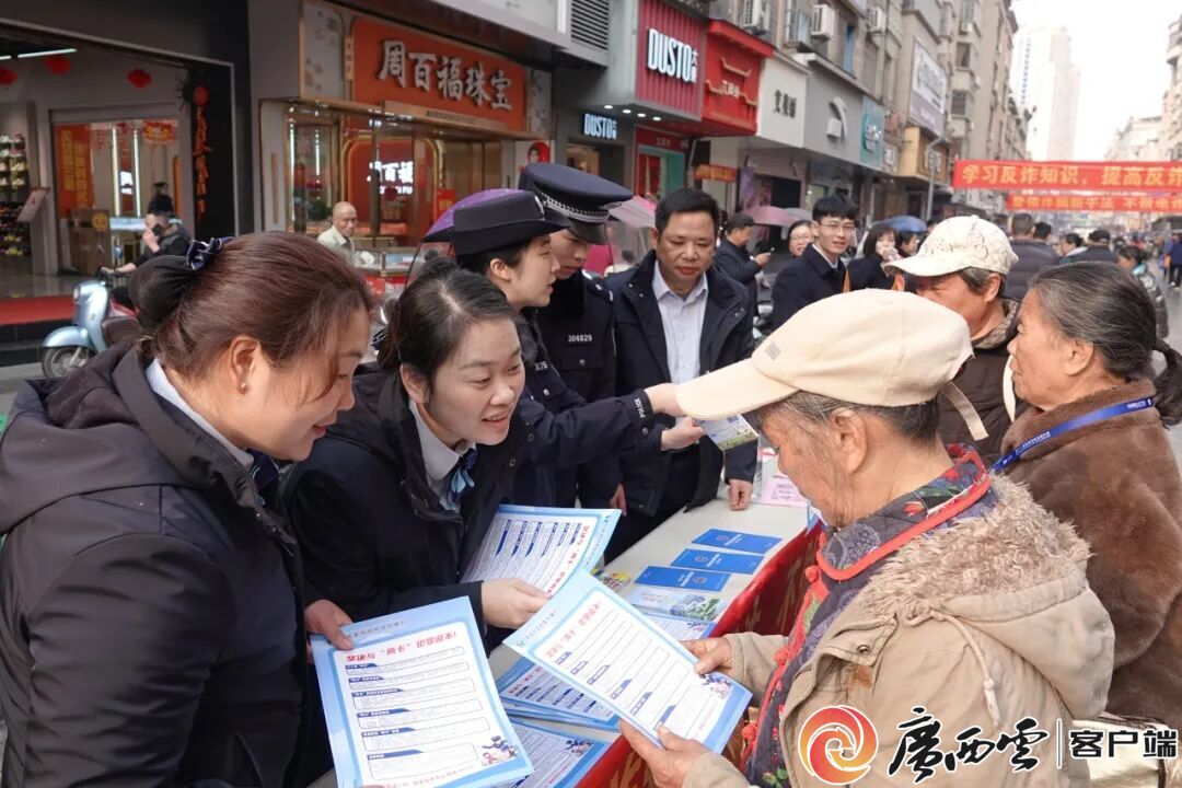 全州開展“歲末守護·反詐同行”集中宣傳活動。 近日,桂林市全州縣步行街人頭攢動,由該縣公安局反詐中心聯合縣鎮政府、社區、金融監管局、銀行及通信運營商等24家單位,在此開展“歲末守護·反詐同行”集中宣傳活動。活動將反詐宣傳、禁毒科普、交通安全教育融為一體,以群眾喜聞樂見的形式普及安全知識,吸引1600余名居民參與。