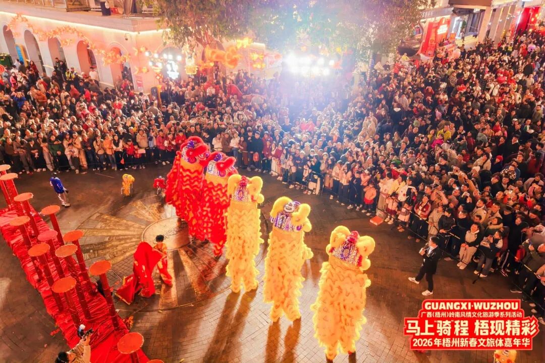 夜色漸濃,西街游客熙熙攘攘。 陽朔縣融媒體中心記者 鐘玲麗 攝 以主題鮮明的文旅活動營造濃厚節日氛圍。圍繞“歡歡喜喜過大年”主題,各圖書館、文化館精心組織“賞年畫 過大年”主題展覽、惠民文藝演出等系列活動。各博物館開展2026年“博物館里過大年”活動190余項,切實豐富群眾游客節日文化生活。南寧市以承辦中央廣播電視總臺《2026年春節戲曲晚會》為契機,讓傳統戲韻在情景交融中綻放時代光彩,青秀山風景區打造集觀燈、賞花、演藝、市集、研學于一體的新春體驗,大年初一游客量達23.42萬人次,創歷史新高。北海海絲首港·合浦始發港景區巧妙融合海絲文化與漢風漢韻,打造傳統海捕、大型實景煙花劇等新春盛宴。桂林市在兩江四湖景區舉辦“‘桂’客盈門·策馬躍潮年”活動,以千架無人機演繹城市符號,生動詮釋“文化+旅游+科技”深度融合。
