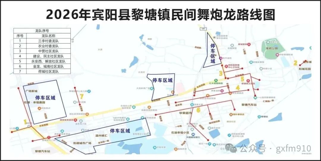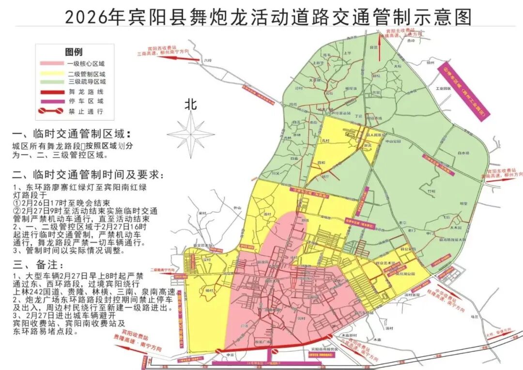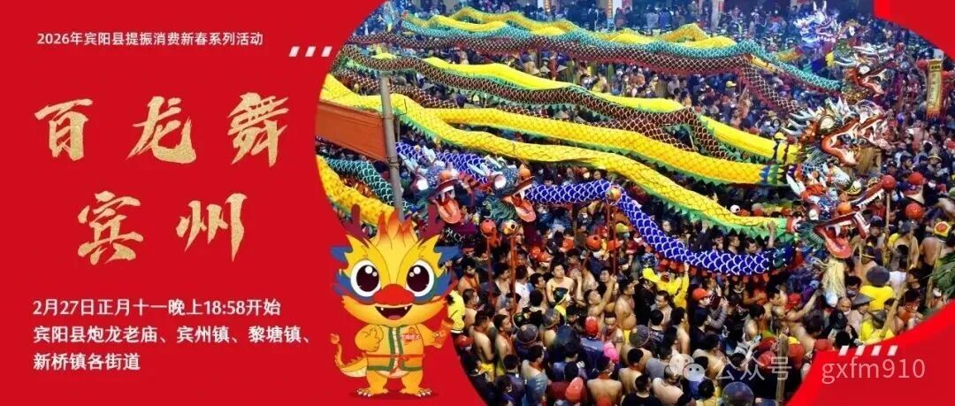 圖源:南寧交警 2026年賓陽縣百龍舞賓州 舞炮龍活動指南 正月十一(本周五) 賓陽舞炮龍活動即將來襲 這場被譽為“東方狂歡節”的 國家級非遺盛宴 即將在馬年新春燃炸登場 今年更有潮汕英歌舞跨界同臺 AI機器人舞炮龍全新解鎖 非遺與科技碰撞 狂歡升級不止一點點 這份預告攻略請提前收藏 舞炮龍時間及地點 活動時間:2月27日18時58分,賓陽縣賓州鎮、黎塘鎮、新橋鎮(農歷正月十一);鄒圩鎮(農歷正月初二);武陵鎮(農歷正月十二)。 地點:縣炮龍文化廣場、蘆圩炮龍老廟、賓州鎮黎塘鎮、新橋鎮、思隴鎮、鄒圩鎮、武陵鎮各村委(社區)。
