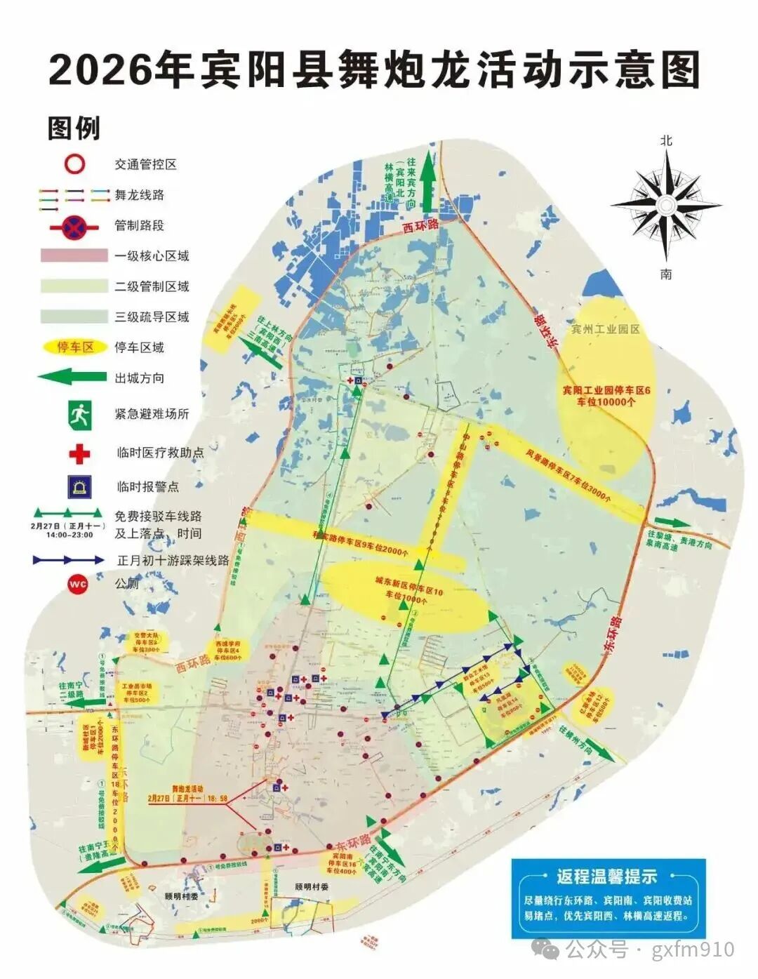 停車區及公廁點 免費停車:游客可在無舞炮龍路段道路兩側、交警劃定的20個停車區有序停車;全縣各級黨政機關、企事業單位(含學校)、社會團體、小區內的停車場、空閑地等免費開放(注意:舞炮龍路段兩側嚴禁停車)。 免費衛生間:全縣公廁以及全縣各級黨政機關、企事業單位(含學校)、社會團體的衛生間免費對游客開放,并倡議沿街兩側居民主動向外地游客開放衛生間,為游客提供便利。 游客免費接駁車:從縣城各主要停車場接送游客至縣炮龍文化廣場、臨浦街附近區域。 運行時間:2月27日(農歷正月十一)12:00-23:00。游客可在接駁車沿線的指定乘車點有序上下車,接駁車在確保安全前提下招手即停,具體如下: 1號線:西環路和賓路口一博愛醫院一昆侖集團一縣交管大隊一工業品紅綠燈一東環路架橋底一廖寨紅綠燈一炮龍文化廣場; 2號線:賓蓮路新廖村委路口一賓蓮思遠路府前路口一賓蓮府前路口一馬蘭轉盤紅綠燈一鳳凰湖公園; 3號線:風景中山路口一中山和賓路口一中山路湖景紅綠燈一金城廣源路口一廣源財政路口一縣文化廣場一鳳凰湖公園; 4號線:民族中學紅綠燈一臨浦路賓中后門一臨浦和賓路口一臨浦路陸村頭; 5號線:梧碩高速(S40)賓陽出口一 一級連接口一東環路王明路口一縣炮龍文化廣場。 便民服務:“賓陽雷鋒 問路問事”志愿者在各主要路口為游客提供便民服務。 一、在安全的前提下鉆龍肚、伴龍行沾喜慶,但嚴禁拉扯龍頭、龍珠、龍須、龍布、龍鱗等。 二、舞炮龍需要力量和技巧,未經龍隊指導或允許,請勿擅自參與舞龍。 三、請勿穿戴易燃的外套、裙子、絲襪等服飾,做好安全防護措施,事先準備口罩、耳塞、護目鏡等,同時保管好隨身物品,做好自身安全保障并照看好老人和小孩。 四、游客可以在觀龍時放鞭炮,在炮龍的周圍燃放或者把點燃的鞭炮掛在龍頭、龍身上,嚴禁向舞龍隊員及周邊群眾、車輛投擲鞭炮。嚴禁捆扎燃放鞭炮或互拆用鞭炮嬉鬧、攻擊。 五、舞炮龍活動期間,不要扎堆燃放煙花爆竹;嚴禁使用滿地紅、大頭炮、甩炮、火柴炮、子母炮、沖天炮、魚雷等,只允許燃放本地常用的傳統普通小鞭炮(裝藥量控制在0.02克以下);嚴禁向炮龍、人群及車輛投擲炮花炮竹和其他危險物品。 六、炮龍老廟附近的居民樓頂不允許人員駐留,以防發生樓房或陽臺崩塌等安全事故;因炮龍老廟地方狹窄且屬老街區,不建議游客前往,除賓陽縣城賓州鎮炮龍文化廣場、炮龍老廟和大部分社區、街道外,黎塘鎮、新橋鎮、武陵鎮也開展開光、舞炮龍活動,請群眾就近參觀舞炮龍活動。 七、為防止踩踏事件的發生,請遠離擁擠人群。 八、服從現場工作人員指揮,有序停車;如遇緊急情況,請就近尋找執勤民警或撥打110報警。 |